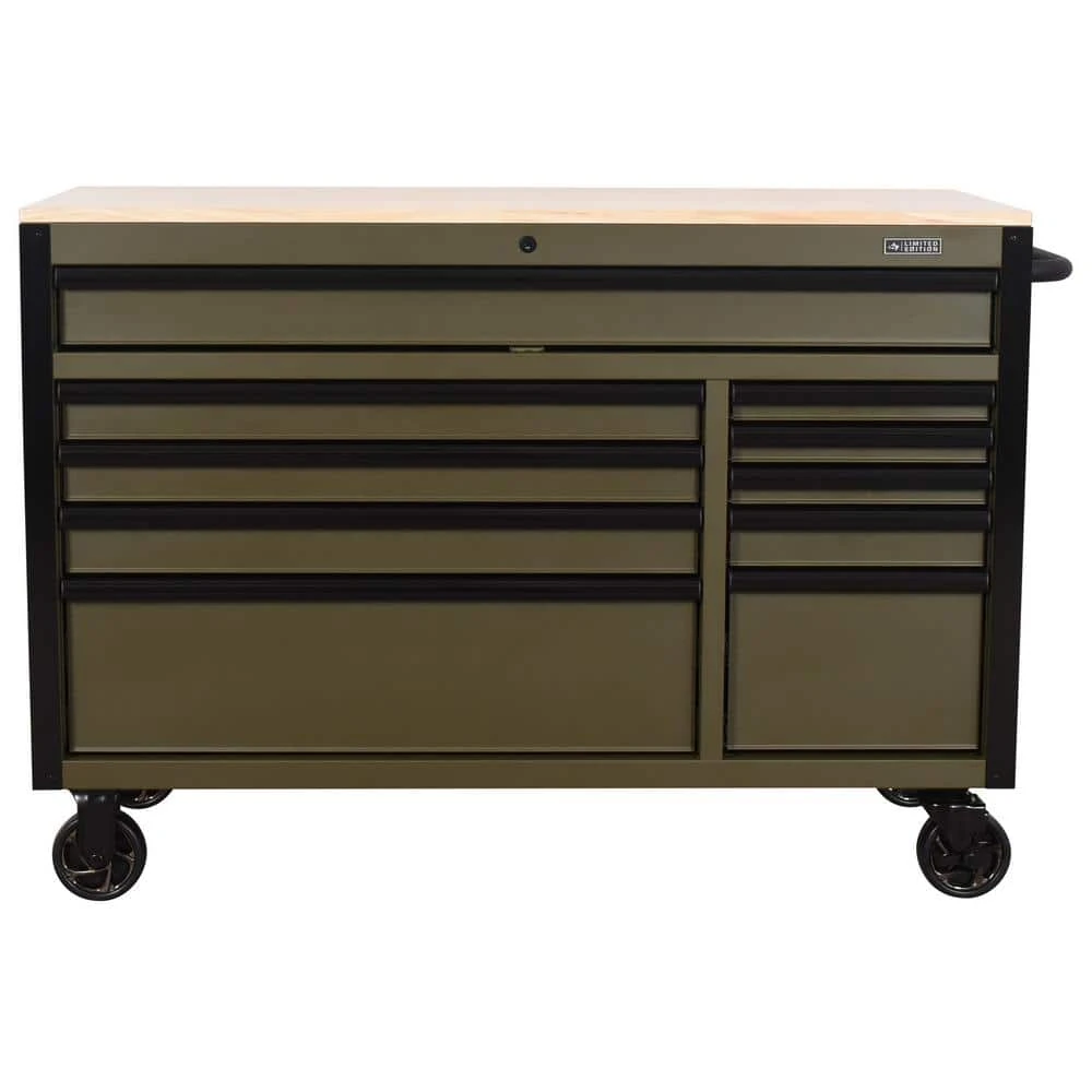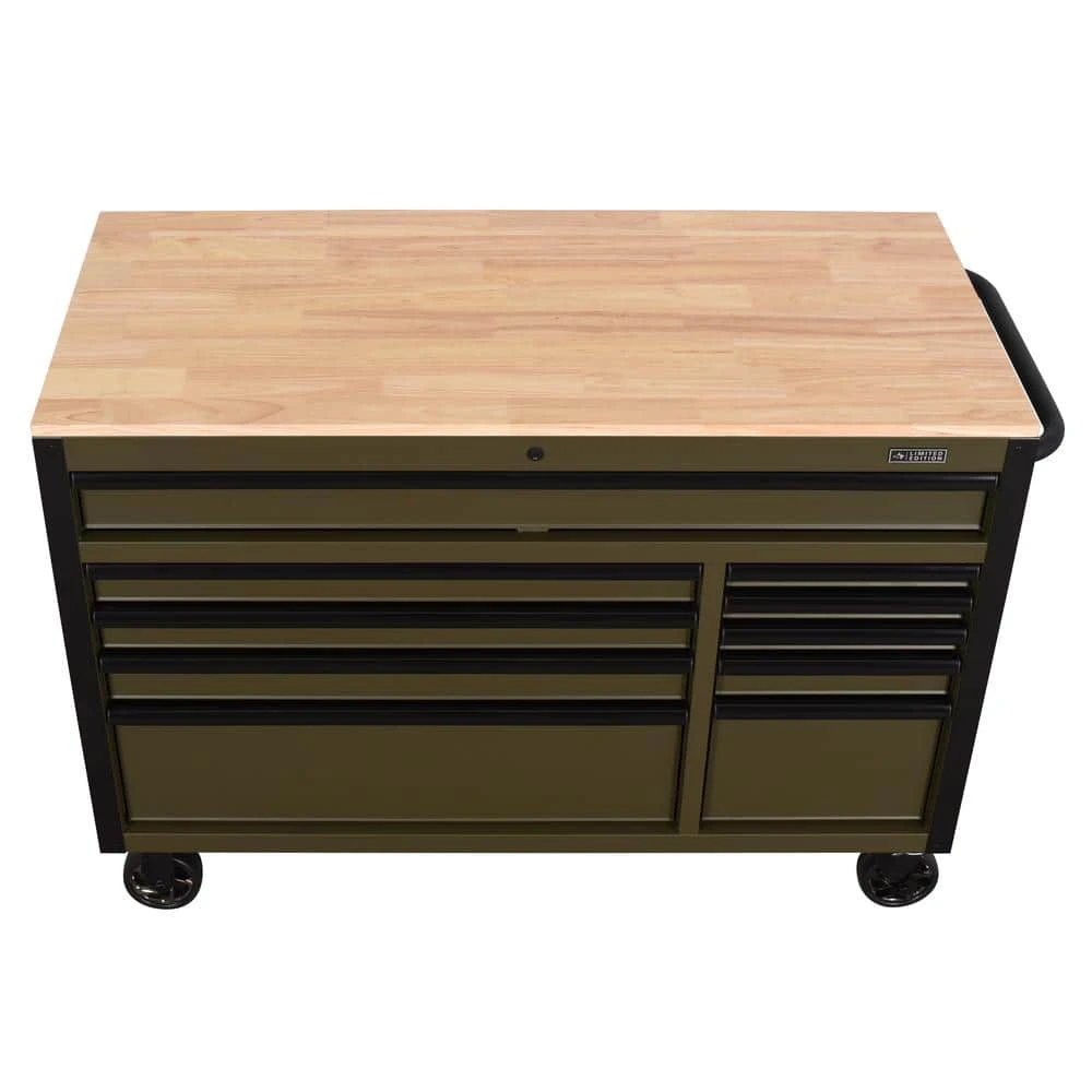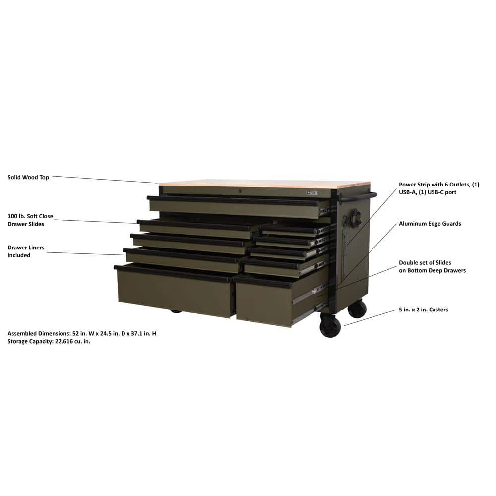 The Husky Limited Edition 52 in. W x 24.5 in. D 10-Drawer Matte Army Green Mobile Workbench with Solid Wood Top is here. This workbench is constructed of 21-Gauge steel and has a large wood surface for all your projects. The 10-drawers combine for 22,616 cu. in. of storage space. All drawers glide effortlessly on 100 lbs. rated ball-bearing slides. These slides are also equipped with a soft-closing mechanism that prevents your drawers from slamming shut. Each drawer also has a pre-cut liner inside to help keep your tools in place. On the side of the workbench is an integrated power strip that has 6-outlets and 2 USB ports. Storage hooks are available when cord is not in use. Finally, there are 5 in. x 2 in. casters and a push handle that will allow you to move the workbench around your work space with ease.