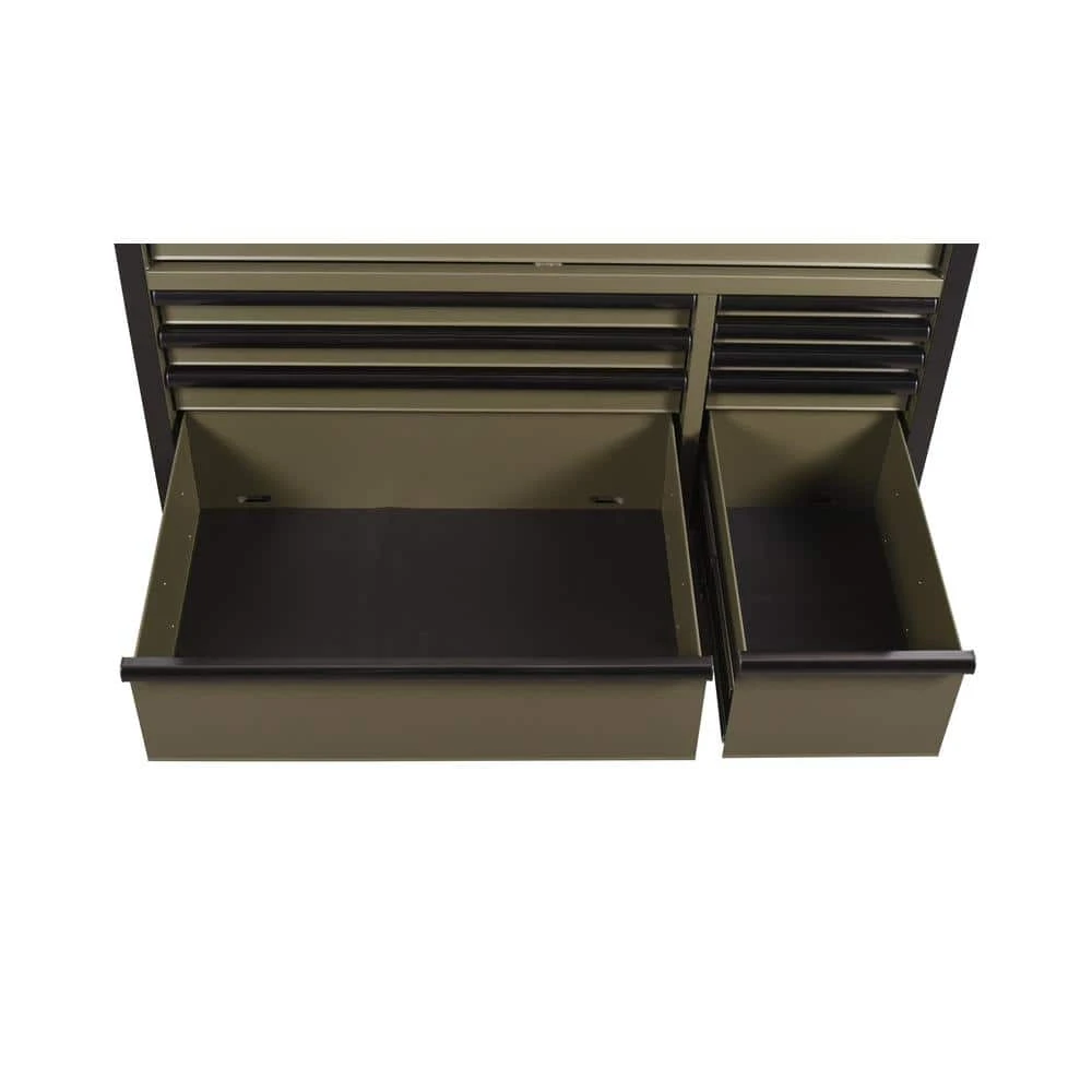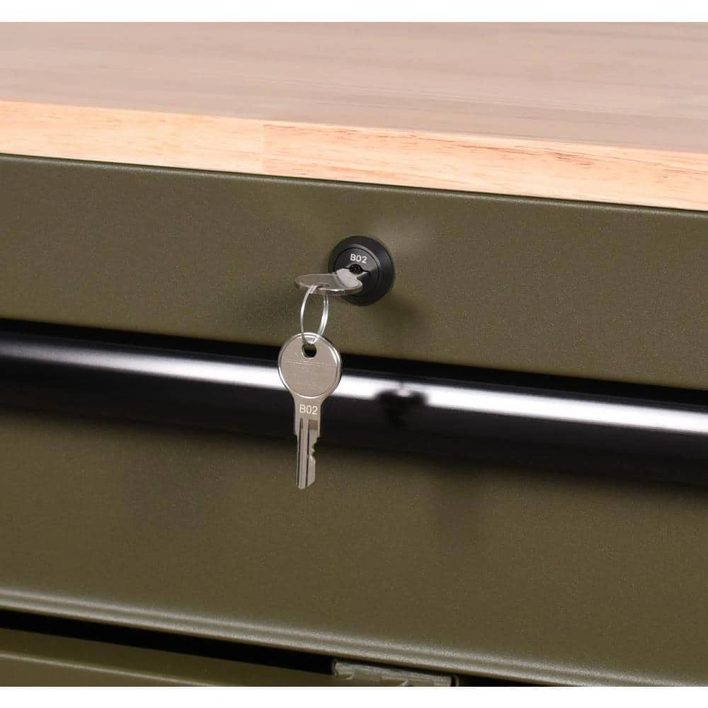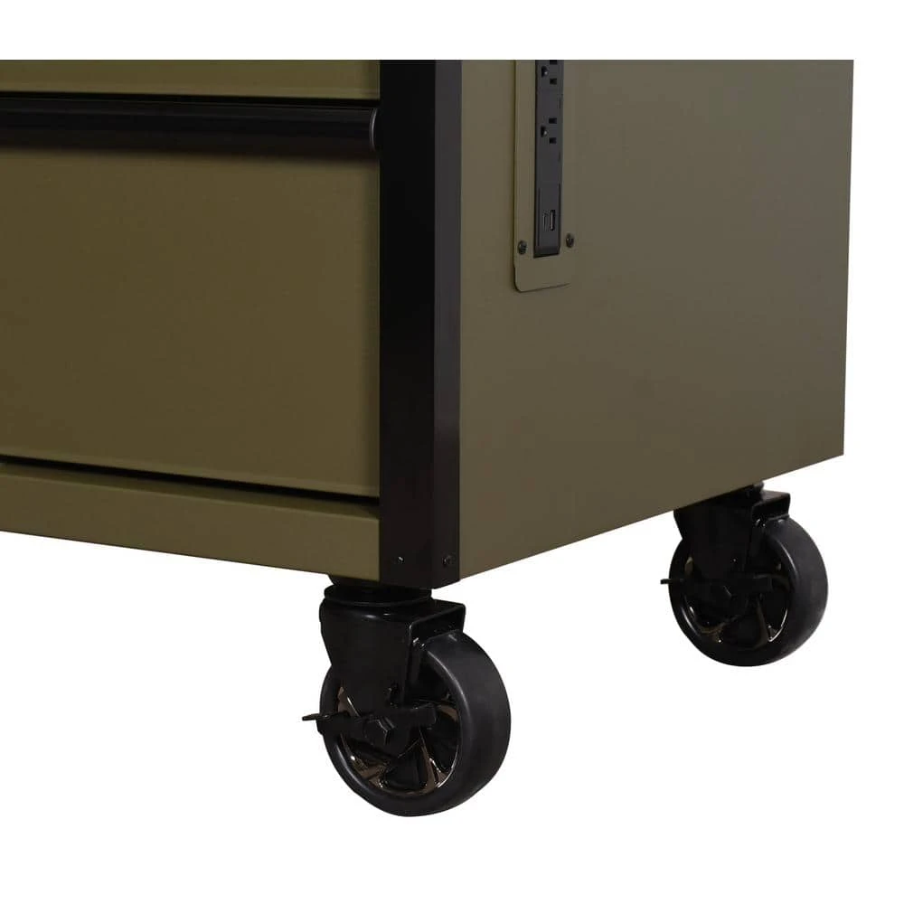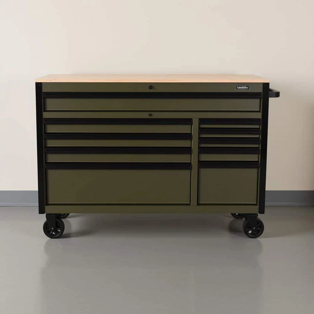 The Husky Limited Edition 52 in. W x 24.5 in. D 10-Drawer Matte Army Green Mobile Workbench with Solid Wood Top is here. This workbench is constructed of 21-Gauge steel and has a large wood surface for all your projects. The 10-drawers combine for 22,616 cu. in. of storage space. All drawers glide effortlessly on 100 lbs. rated ball-bearing slides. These slides are also equipped with a soft-closing mechanism that prevents your drawers from slamming shut. Each drawer also has a pre-cut liner inside to help keep your tools in place. On the side of the workbench is an integrated power strip that has 6-outlets and 2 USB ports. Storage hooks are available when cord is not in use. Finally, there are 5 in. x 2 in. casters and a push handle that will allow you to move the workbench around your work space with ease.