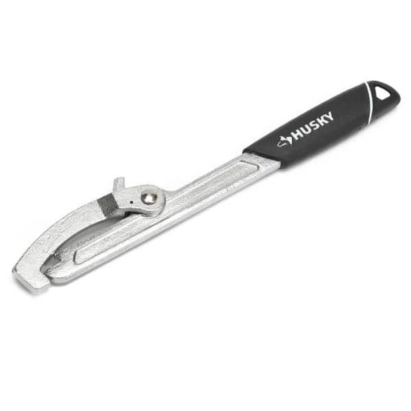 Husky’s 12 in. adjustable Lock Nut Wrench tightens and removes sink strainer lock nuts on strainer baskets. The spring-loaded jaw automatically adjusts to fit most sink strainer lock nuts. The long handle allows access to hard-to-reach nuts while the dual-material cushion grip provides user comfort. Durable construction and covered by the Husky lifetime warranty.