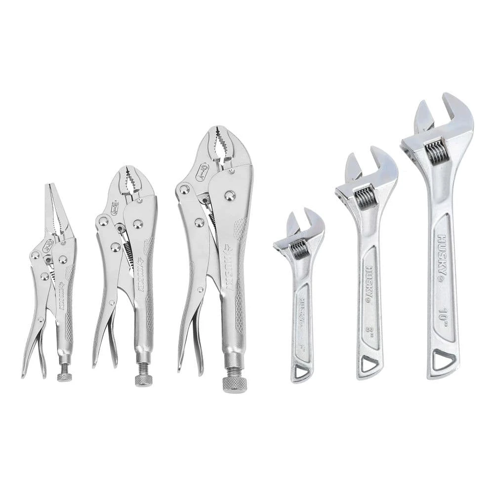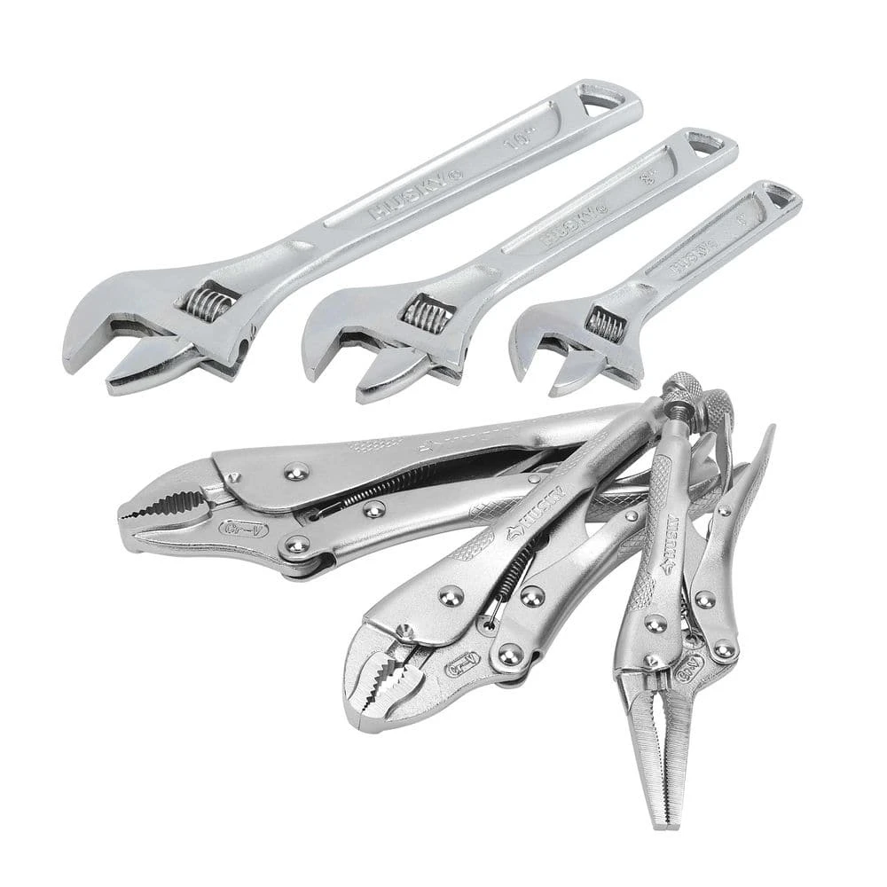 - Set includes: (1) 6-in. adjustable wrench, (1) 8-in, adjustable wrench, (1) 10-in, adjustable wrench, (1) 6 1/2-in. long nose locking pliers, (1) 7-in. locking pliers and (1) 10-in. locking pliers.