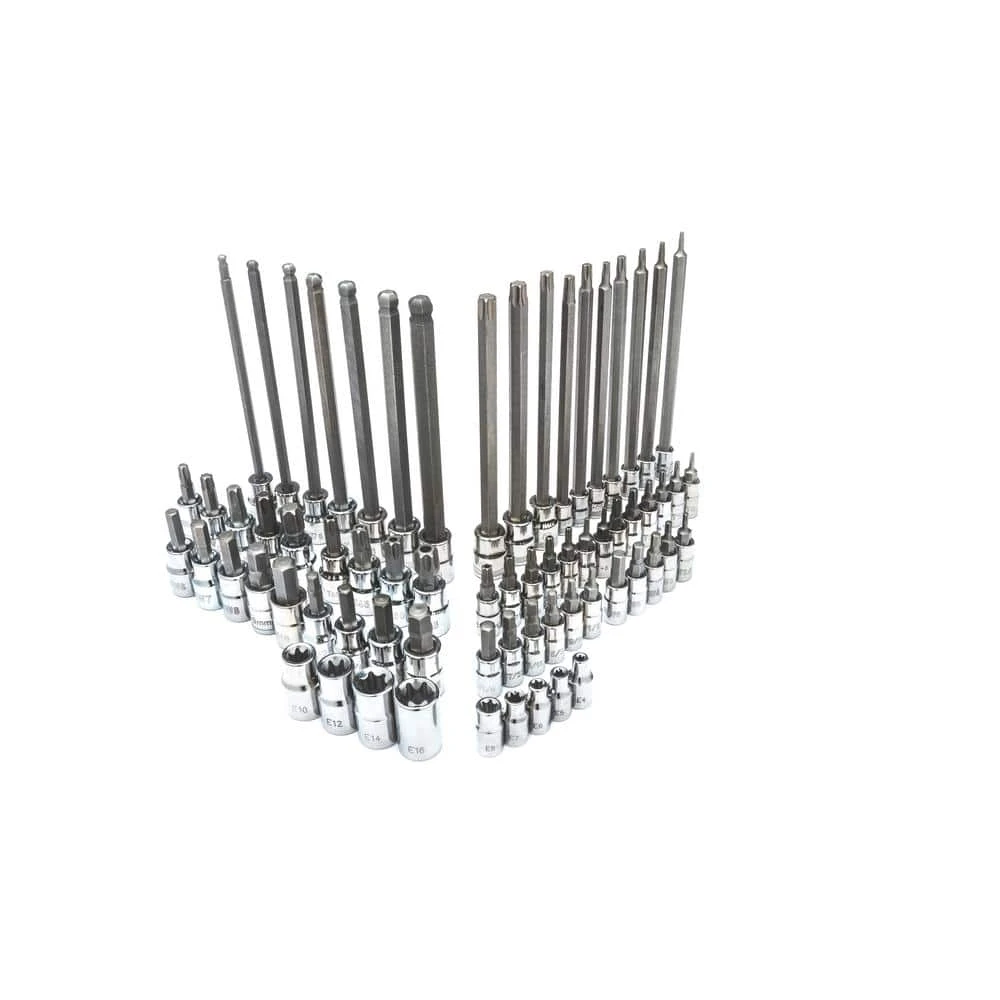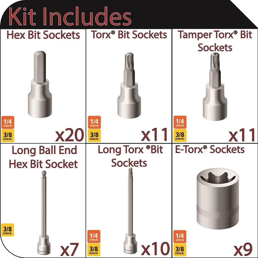 The Husky 1/4 in. and 3/8 in. Drive 68-Piece all-in-one bit socket set features 6-different styles of bit heads and is perfect to complete your socket collection. Alloy steel construction of both the sockets and bits provides durability and long-lasting performance. The set is packed in a durable blow mold case for easy organization and storage. This set covers SAE and metric hex, Torx, tamperproof Torx, and External Torx.