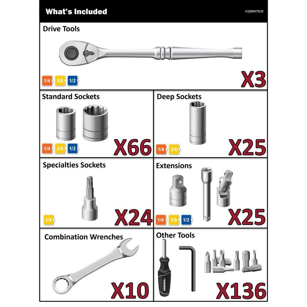 The Husky 289-piece 1/4 in, 3/8 in. and 1/2 in. drive Mechanics Tool Set offers a comprehensive selection of tools for the professional or DIY-mechanic’s workshop. Packed into a handy storage case with tool trays marked by drive size, the 91 different standard and deep sockets, along with the 10 combination wrenches and 24 bit sockets, will allow you to tackle any fastening or repair project. This Husky 289-piece tool set will provide the novice or professional with a huge assortment of durable and reliable tools to get the job done. 3 ratchets, 66 standard sockets, 25 deep sockets, 14 extensions, 10 combination wrenches and 171 other tools including adapters, universal joints, hex keys, etc. make up this mechanics tool set. for a complete listing of tools included, see specification document in the info and guides section.