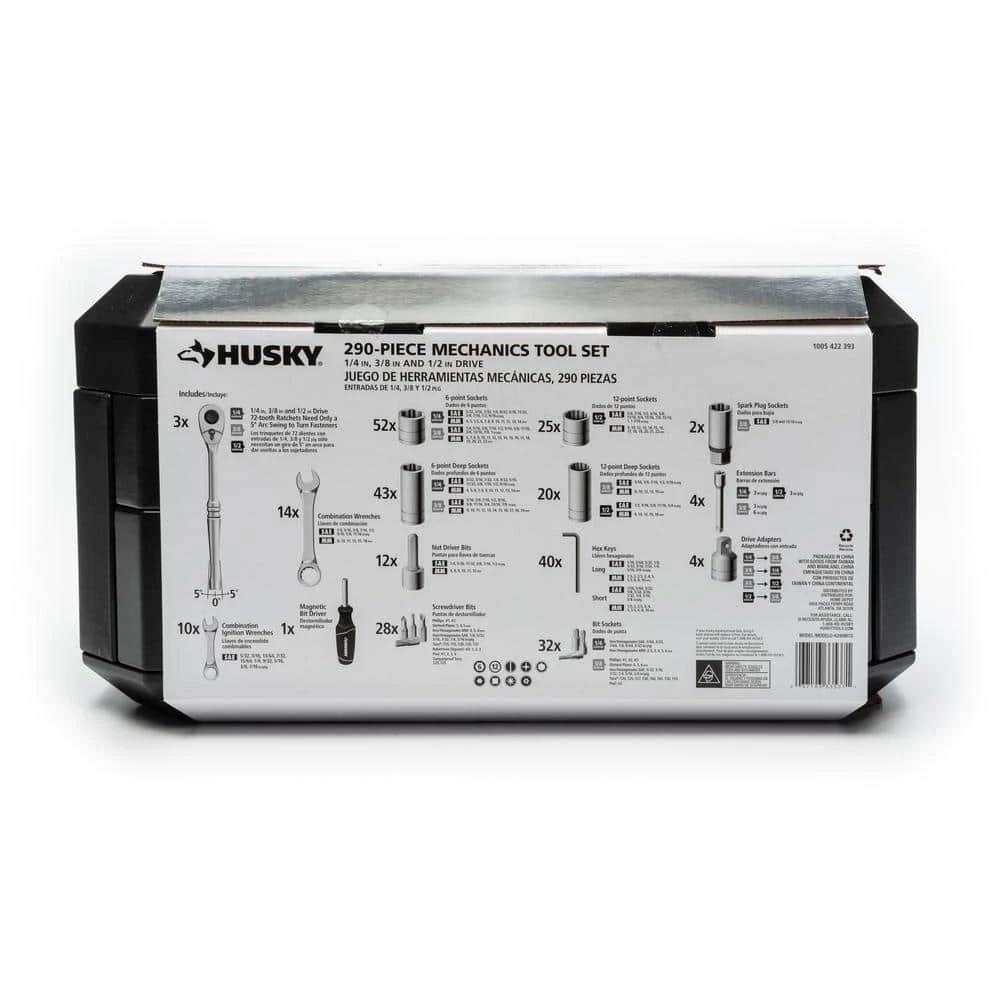 The Husky 314-piece 1/4 in., 3/8 in. and 1/2 in. drive mechanics tool set offers a comprehensive selections of tools for the professional or DIY mechanics workshop. The wide variety of standard and deep sockets along with the assortment of combination wrenches and bit sockets will allow you to tackle any fastening or repair project. This Husky 314-piece tool set will provide the novice or professional with a huge assortment of durable and reliable tools to get the job done.