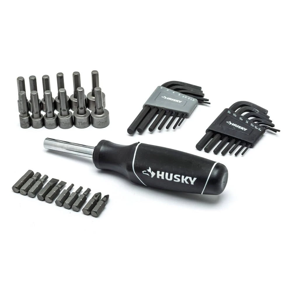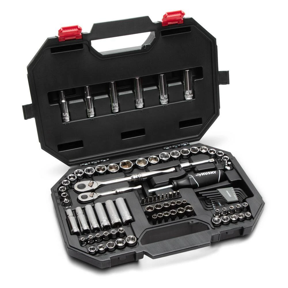 The Husky 94-Piece Mechanics Tool Set is a perfect set for the home DIYer or professional mechanic. The 53 different standard and deep sockets allow you to tackle a range of general fastening or repair projects. Sockets feature chamfered lead-ins to help provide fast and easy placement onto drive tools and fasteners. Set also includes 37 accessories, two extensions, two ratchets, and a storage case to keep it all organized. Compact and versatile for nearly any job, this mechanics tool set features an assortment of 1/4 in. and 3/8 in. drive sockets as well as accessory and drive tools for ultimate convenience. The 72-tooth ratchets need only 5° to turn a fastener, for hard to reach areas. For a complete product listing, see specification document.