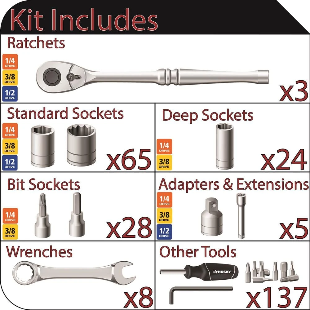 The Husky 270-piece Mechanics Tool Set offers a comprehensive selection of tools for the professional or DIY mechanic’s workshop. Packed into a handy storage case with tool trays marked by drive size, the 89 different standard and deep sockets along with 8 combination wrenches and 28 bit sockets will allow you to tackle any fastening or repair project. This Husky 270-piece tool set will provide the novice or professional with a huge assortment of durable and reliable tools to get the job done. 3 ratchets, 65 standard sockets, 24 deep sockets, 3 extensions, 8 combination wrenches and 167 other tools including bit sockets, hex keys, etc., make up this mechanics tool set. for a complete listing of tools included, see the specification document in the info and guides section.