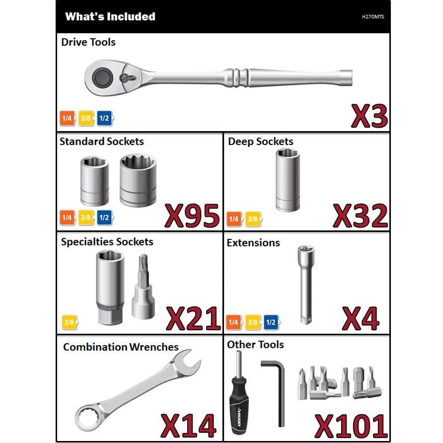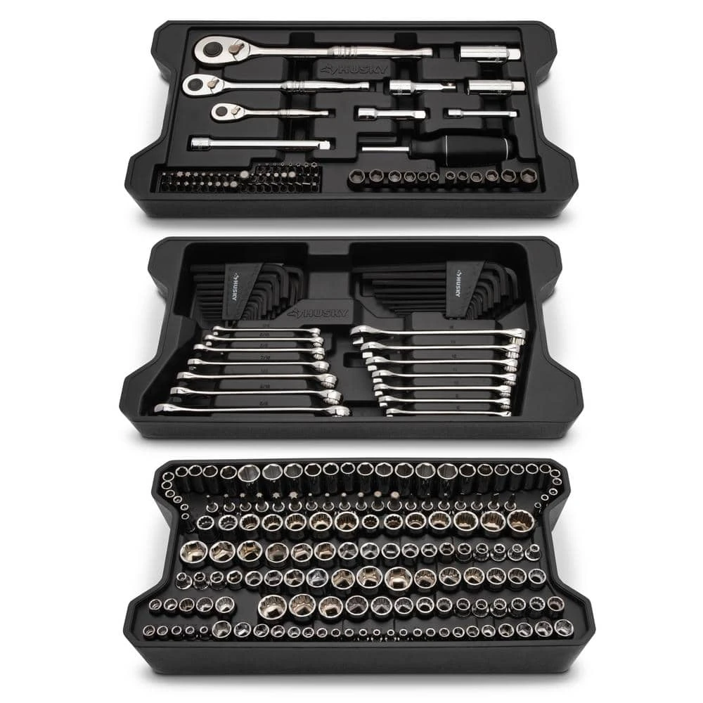 The Husky 270-piece 1/4 in, 3/8 in. and 1/2 in. drive Mechanic’s Tool Set offers a comprehensive selections of tools for the professional or DIY mechanic workshop. The 129 different standard and deep sockets, along with the 14 combination wrenches and 19 bit sockets, will allow you to tackle any fastening or repair project. This Husky 270-piece tool set will provide the novice or professional with a huge assortment of durable and reliable tools to get the job done.
