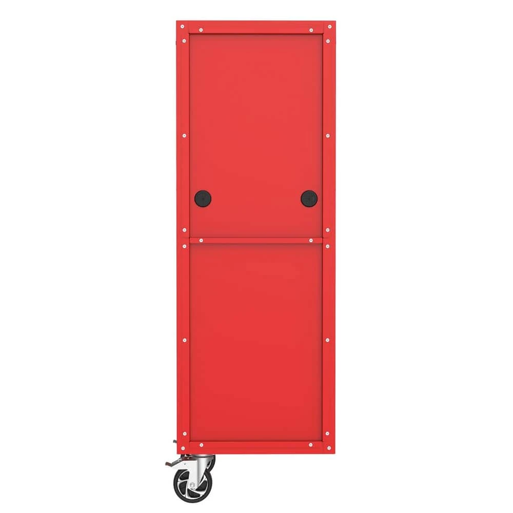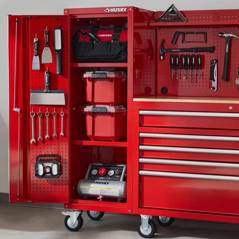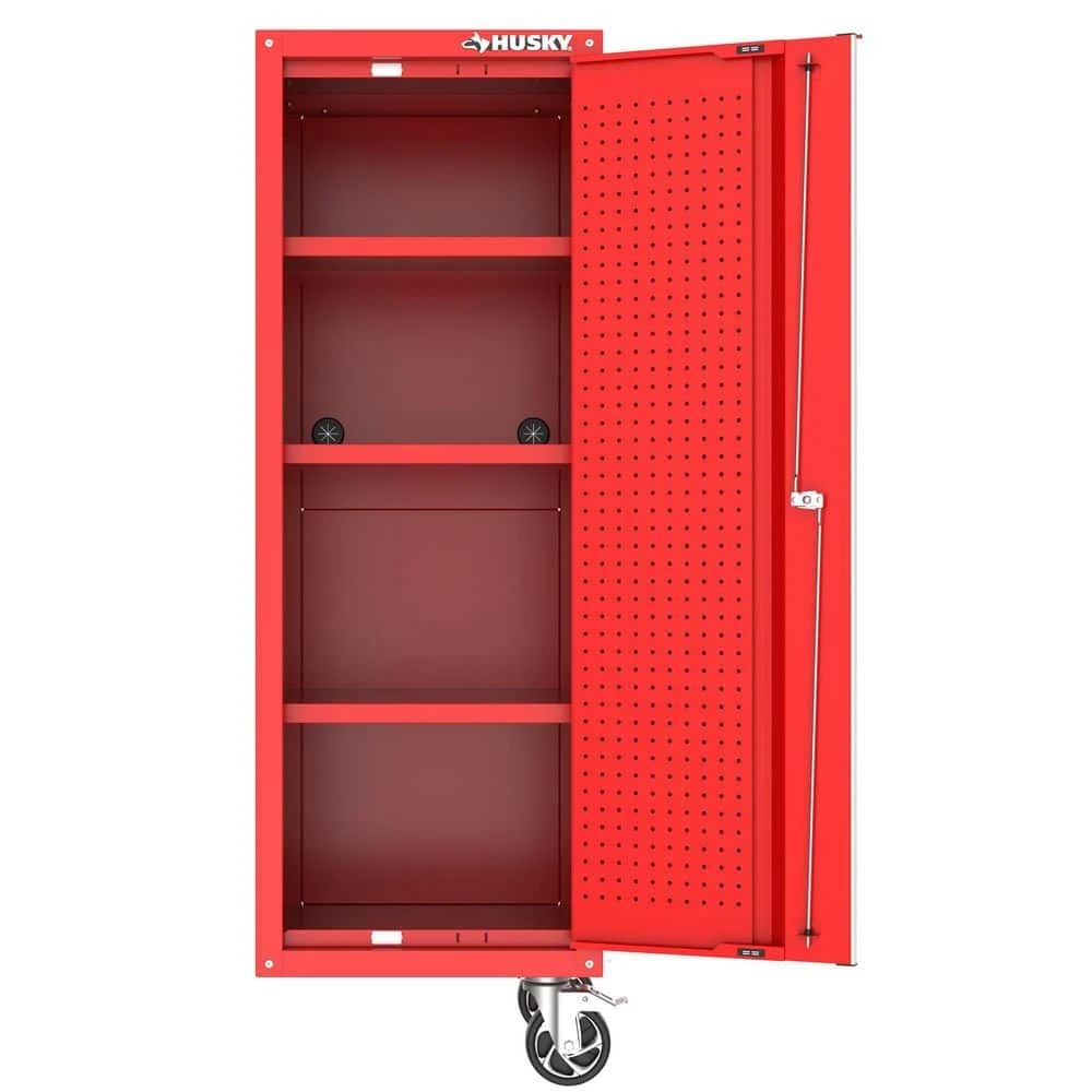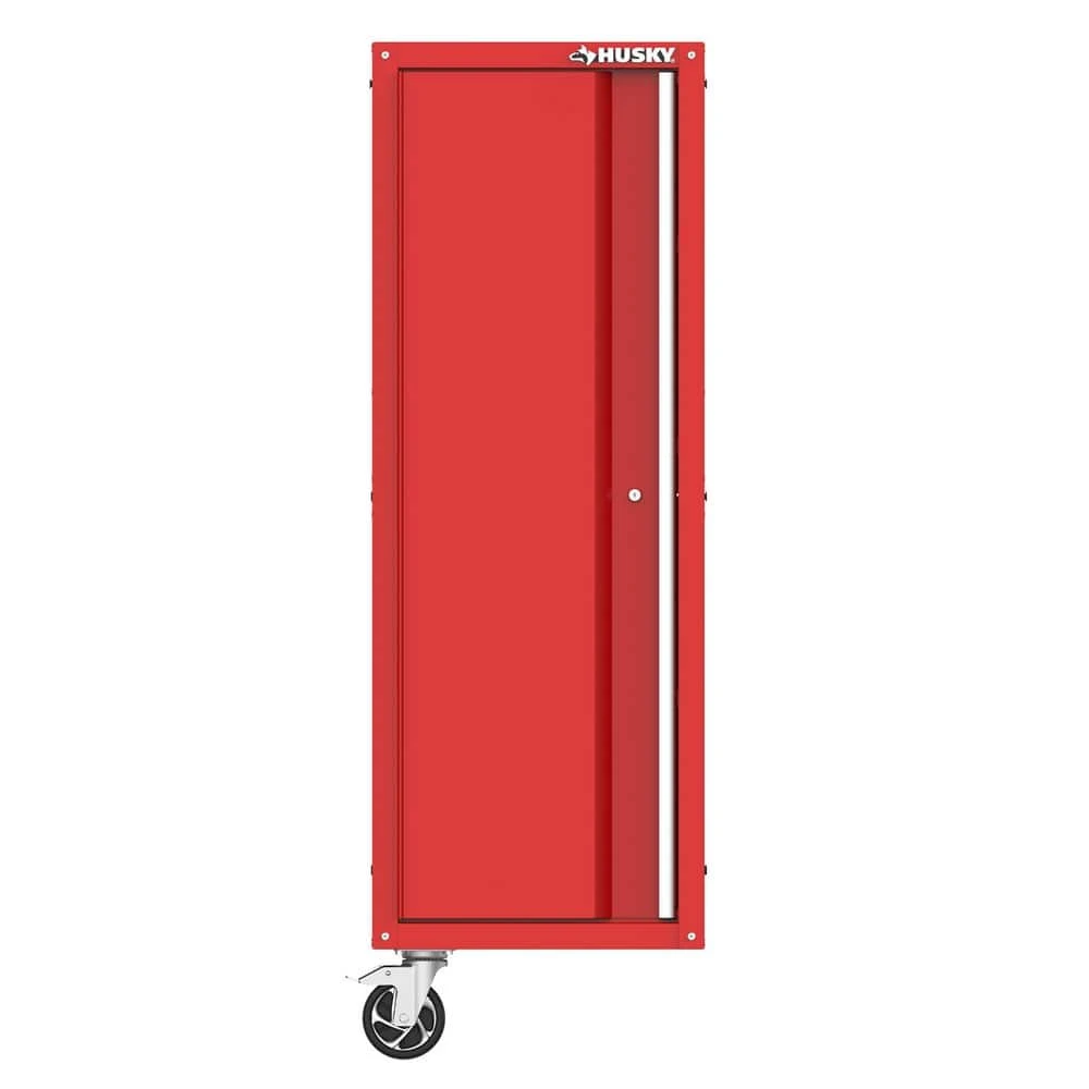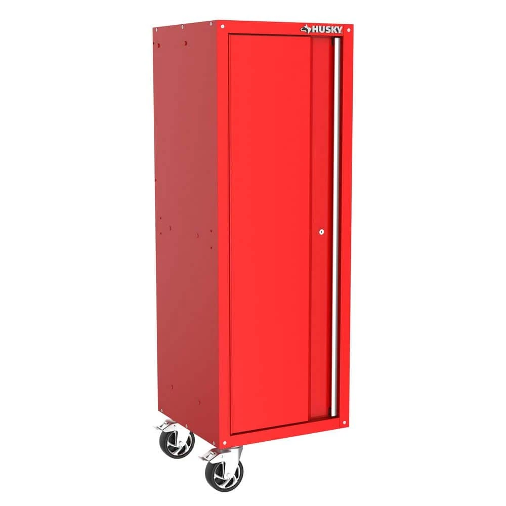 The Husky Modular 20 in. 3-Shelf Red Side Tool Chest is part of a system that allows you to customize your own steel storage configuration. The modular system consists of the mobile workbench, top chest, pegboard, and side locker (all components sold separately). The side tool Chest is constructed of 21-Gauge steel and finished with a rust-resistant powder coat finish. The door can be flipped so that it can mounted on either side of Locker for a custom tool storage system setup. There are 3 adjustable height shelves that will allow you to configure the storage to best fit your needs. The inside of the door has peg hook holes to organize hanging tools and supplies. 2 grommets will allow you to pass any cords into the locker for charging needs. This Husky 20 in. W 3-Shelf Red Side Tool Chest will be a great addition to your modular workspace.
