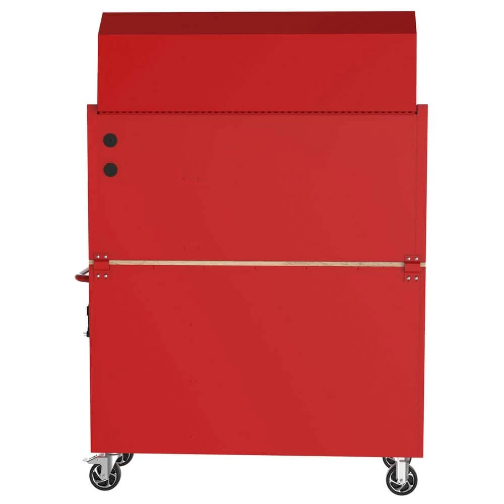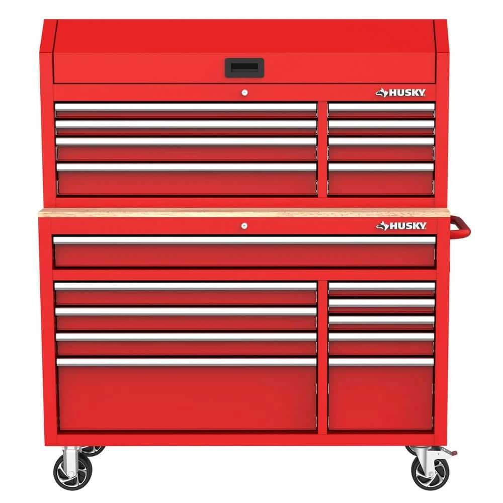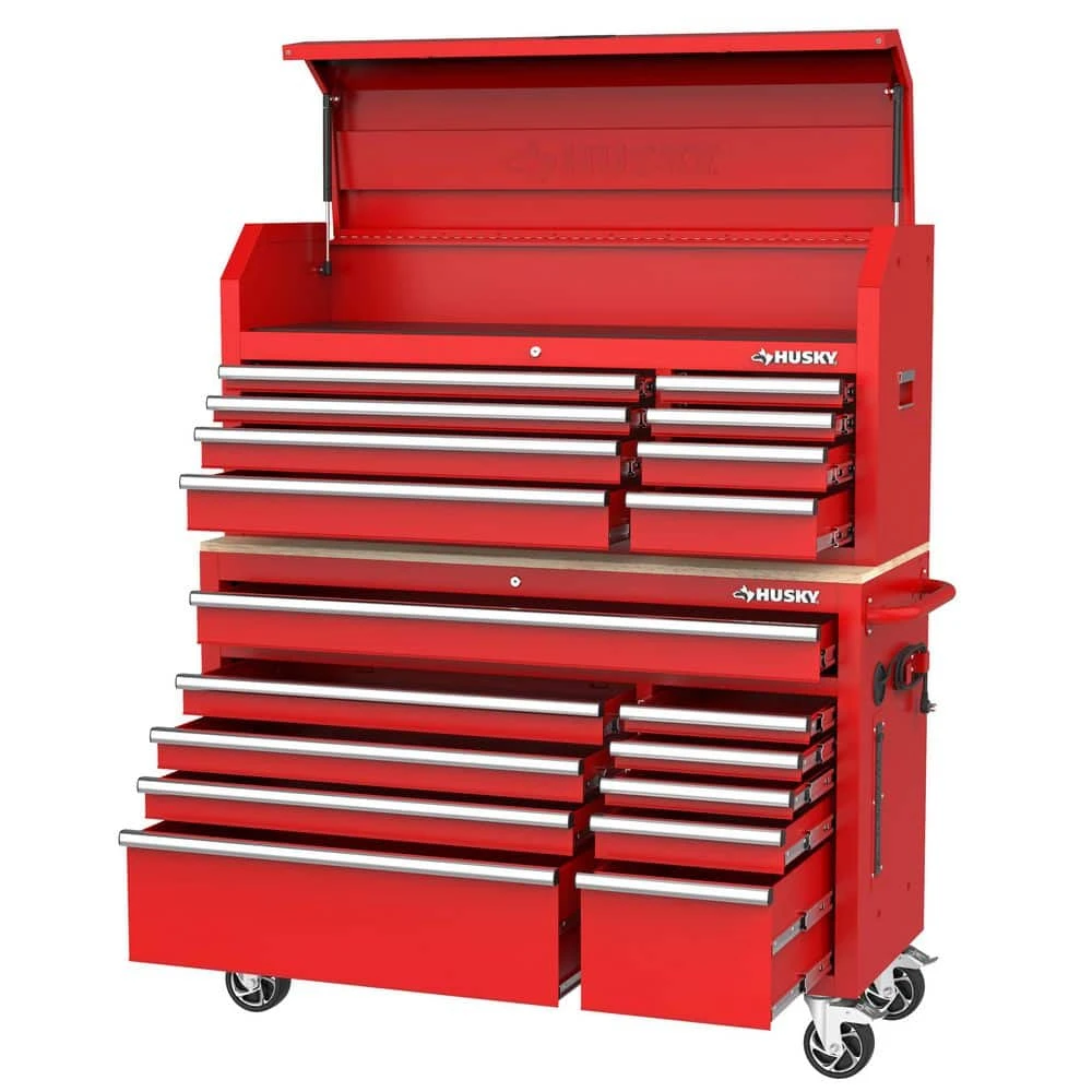 The Husky Modular 52 in. W 10-Drawer Red Mobile Workbench Cabinet with 8-Drawer Top Tool Chest is part of a system that allows you to customize your own steel storage configuration. This particular combo consists of the 52 in. 10-Drawer Mobile Workbench and 52 in. 8-Drawer Top Tool Chest. Both components are constructed of an all-welded 21-Gauge steel frame and the workbench has a 3/4 in. solid wood top. Eighteen drawers of varying sizes enable one to find the right place to store and organize all your tools, parts and supplies. All drawers have a pre-cut liner and are equipped with 100 lbs. rated ball-bearing slides that feature a soft-closing mechanism that ensures your drawers do not slam closed. There are integrated power strips with 6 outlets and 2 USB ports in both the top till and side of the workbench that will enable you to charge your tools and other electronics. Finally, one can easily move the workbench around the workspace on 5 in. x 2 in. casters with the large ergonomic push handle. This Husky Modular 52 in. W 10-Drawer Red Mobile Workbench Cabinet with 8-Drawer Top Tool Chest will be a great addition to your workspace on its own or combined with the additional modular components.