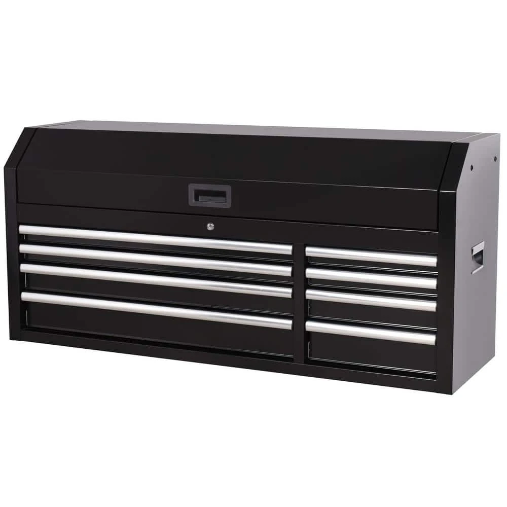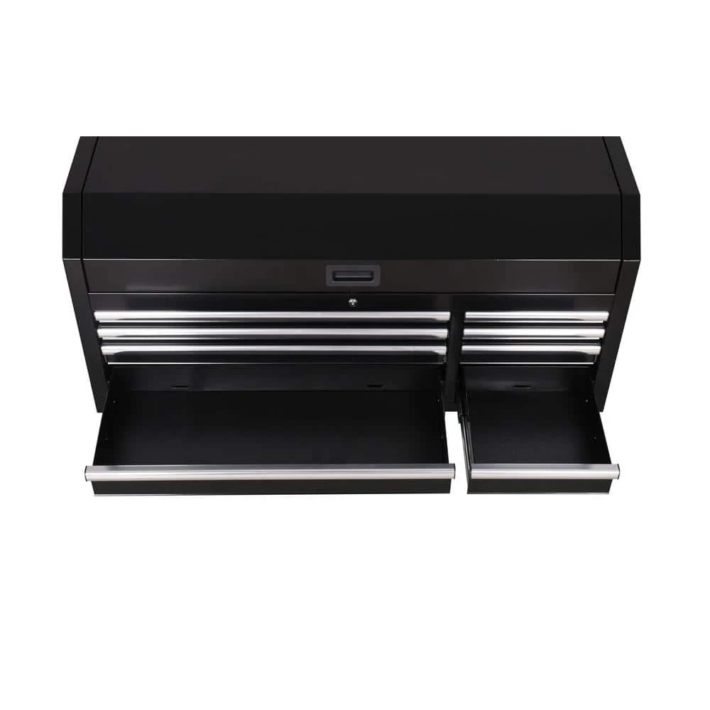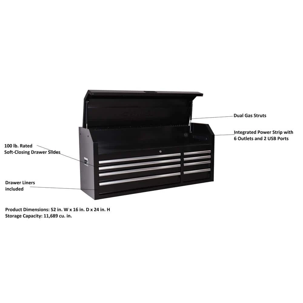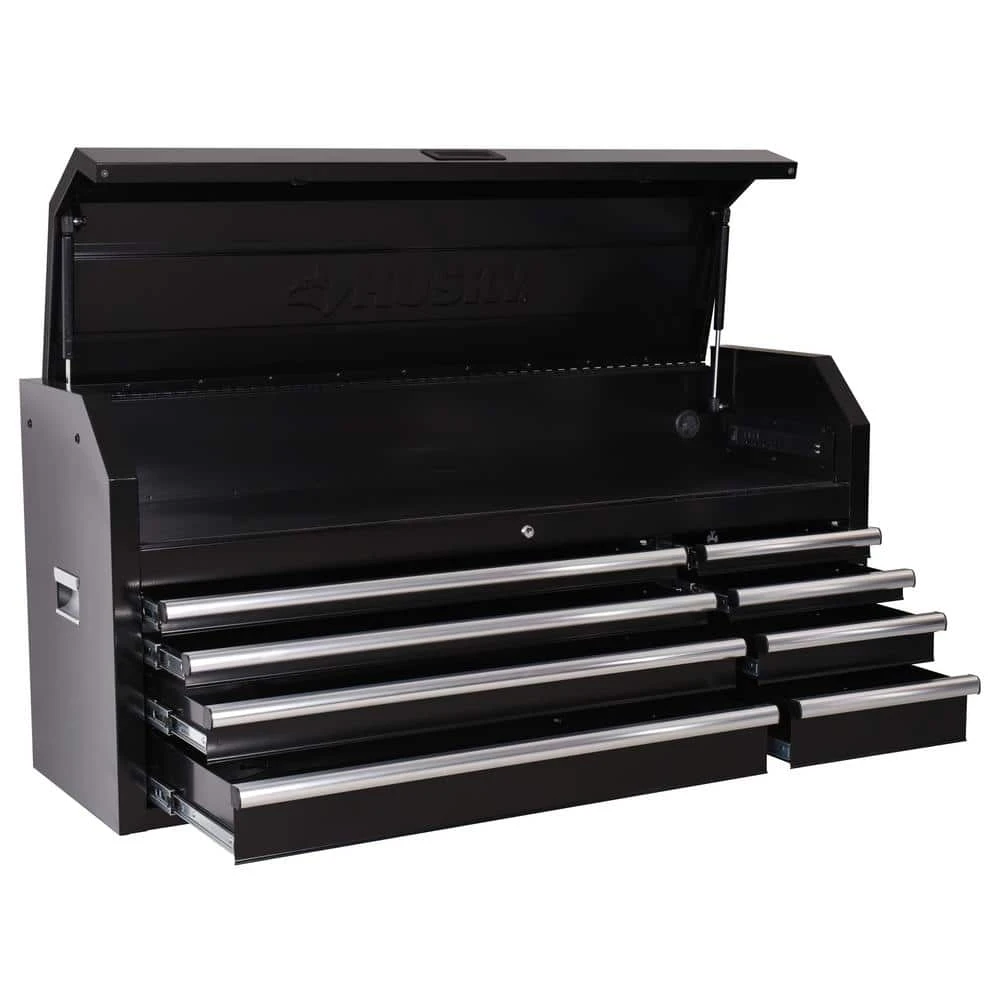The Husky Modular 52 in. W 8-Drawer Black Top Tool Chest is part of a system that allows you to customize your own steel storage configuration. The modular system consists of the mobile workbench, top chest, pegboard and side locker (all components sold separately). The tool chest is constructed of an all-welded 21-Gauge steel body and finished with a rust-resistant powder coat finish. 8 drawers of varying sizes enable 1 to find the right place to store and organize all your tools, parts and supplies. All drawers have a pre-cut liner and are equipped with 100 lbs. rated ball-bearing slides that feature a soft-closing mechanism that ensures your drawers do not slam closed. Gas struts assist with opening and closing the clamshell lid which provides 7.3 in. of clearance for taller tools. On the inside of the chest is an integrated power strip with 6 outlets and 2 USB ports that will enable you to charge your tools and other electronics. This Husky 52 in. 8-Drawer Black Top Tool Chest will be a great addition to your modular tool storage system in your workspace.