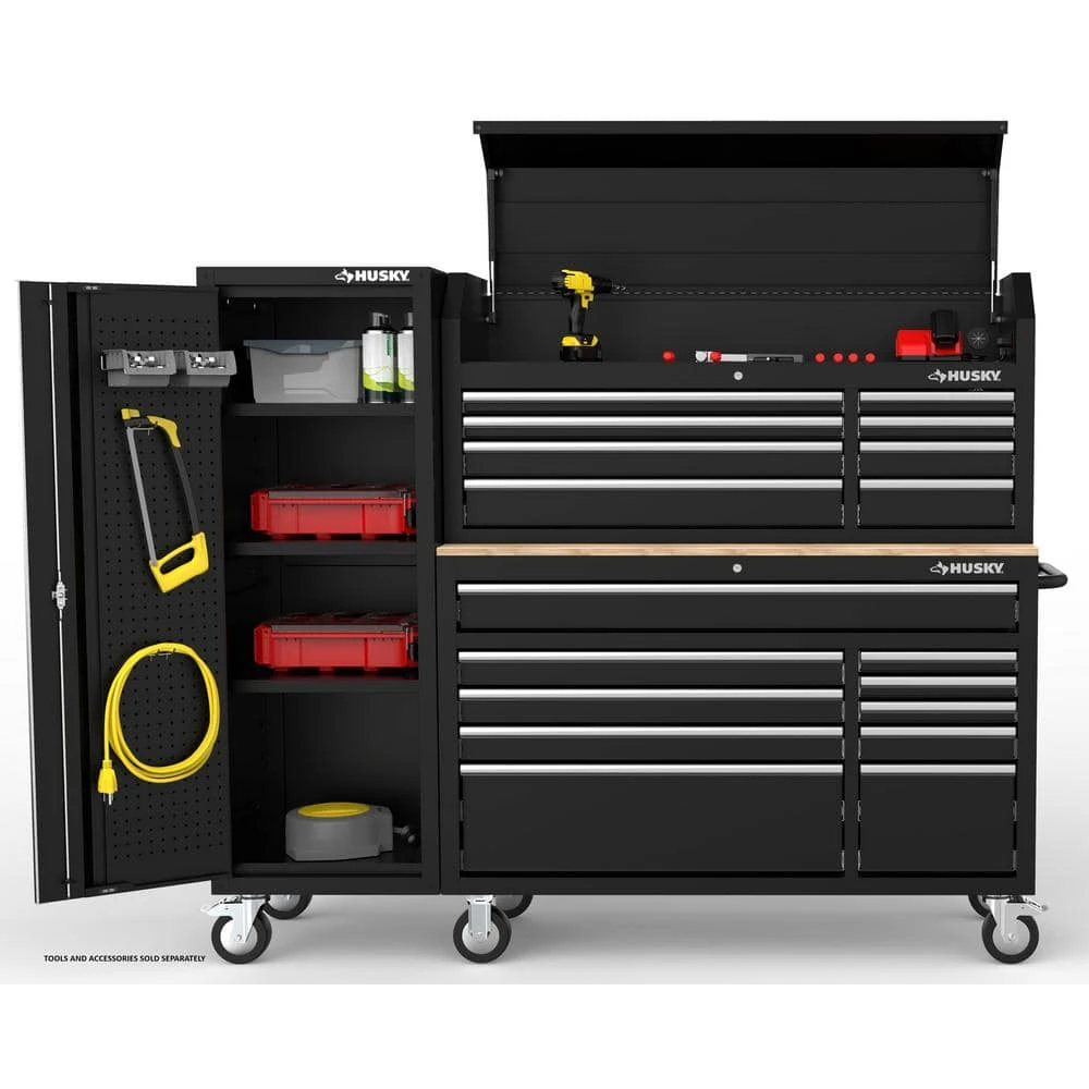 Husky Modular 52 in. W 10-Drawer Black Mobile Workbench Cabinet with 52 in. 8-Drawer Top Chest and 20 in. Side Locker is part of a system that allows you to customize your own steel storage configuration. This particular combo consists of the 52 in. 10-Drawer Mobile Workbench, 52 in. 8-Drawer Top Tool Chest and 20 in. Side Locker All components are constructed of an all-welded 21-Gauge steel frame and the workbench has a 3/4 in. solid wood top. All drawers have a pre-cut liner and are equipped with 100 lbs. rated ball-bearing slides that feature a soft-closing mechanism that ensures your drawers do not slam closed. There are integrated power strips with 6 outlets and 2 USB ports in both the top till and side of the workbench that will enable you to charge your tools and other electronics. The side locker can be mounted on either side of your workbench as the door can be flipped to open either way. There are 3 adjustable height shelves that will allow you to configure the storage to best fit your needs. The inside of the door has peg hook holes to organize hanging tools and supplies. 2 grommets will allow you to pass any cords into the locker. Finally, 1-can easily move the entire system around the workspace on 5 in. x 2 in. casters with the large ergonomic push handle. This Husky Modular system will be a great addition to your workspace on its own or combined with the additional modular components.
