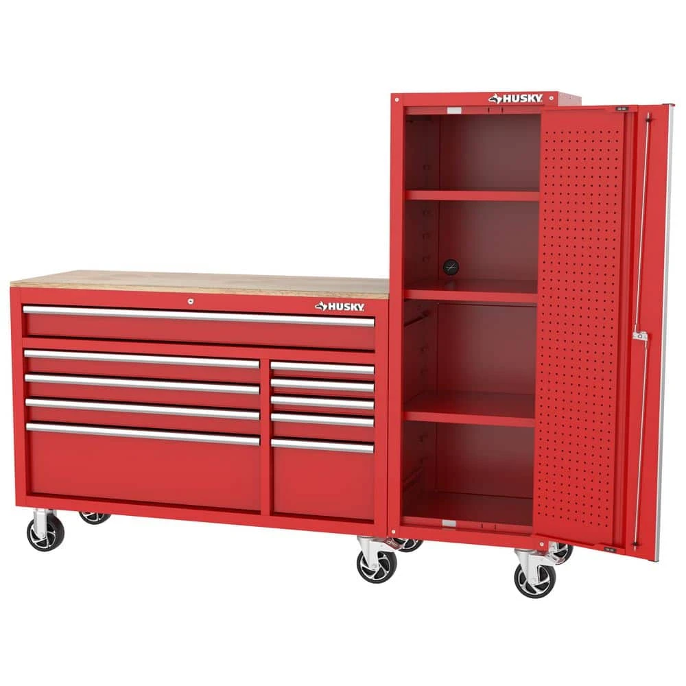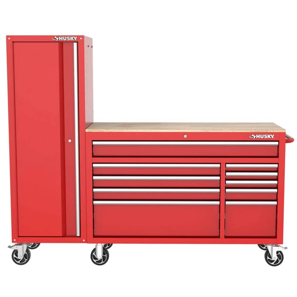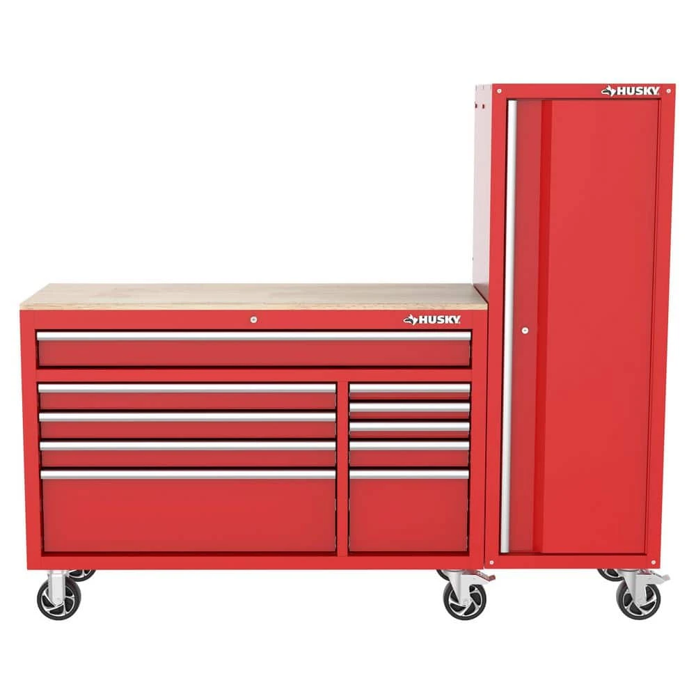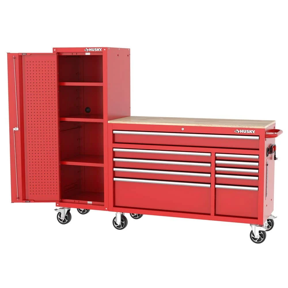 Husky Modular 52 in. W 10-Drawer Red Mobile Workbench Cabinet with 20 in. Side Locker is part of a system that allows you to customize your own steel storage configuration. This particular combo consists of the 52 in. 10-Drawer Mobile Workbench and 20 in. Side Locker All components are constructed of an all-welded 21-Gauge steel frame and the workbench has a 3/4 in. solid wood top. All drawers have a pre-cut liner and are equipped with 100 lbs. rated ball-bearing slides that feature a soft-closing mechanism that ensures your drawers do not slam closed. There is an integrated power strips with 6 outlets and 2 USB ports in the side of the workbench that will enable you to charge your tools and other electronics. The side locker can be mounted on either side of your workbench as the door can be flipped to open either way. There are 3 adjustable height shelves that will allow you to configure the storage to best fit your needs. The inside of the door has peg hook holes to organize hanging tools and supplies. 2 grommets will allow you to pass any cords into the locker. Finally, 1-can easily move the entire system around the workspace on 5 in. x 2 in. casters with the large ergonomic push handle. This Husky Modular system will be a great addition to your workspace on its own or combined with the additional modular components.