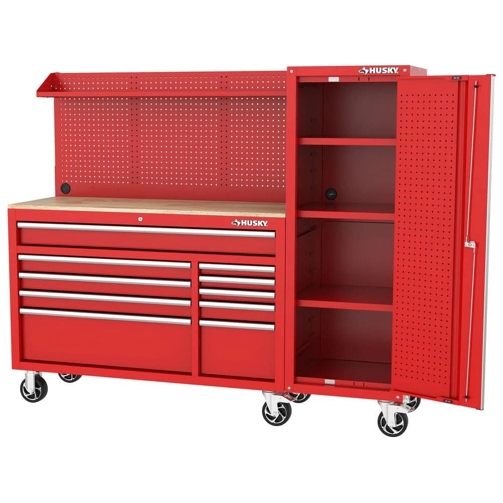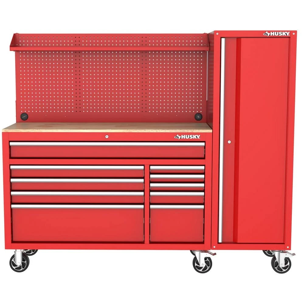 Husky Modular 52 in. W 10-Drawer Red Mobile Workbench Cabinet with Pegboard and 20 in. Side Locker is part of a system that allows you to customize your own steel storage configuration. This particular combo consists of the 52 in. 10-Drawer Mobile Workbench, 52 in. Pegboard and 20 in. Side Locker All components are constructed of an all-welded 21-Gauge steel frame and the workbench has a 3/4 in. solid wood top. All drawers have a pre-cut liner and are equipped with 100 lbs. rated ball-bearing slides that feature a soft-closing mechanism that ensures your drawers do not slam closed. There is an integrated power strip with 6 outlets and 2 USB ports in the top till that will enable you to charge your tools and other electronics. The pegboard easily attaches to the pre-drilled holes on the workbench and provides a place to hang tools and supplies. A full-width shelf can support up to 100 lb. The side locker can be mounted on either side of your workbench as the door can be flipped to open either way. There are 3 adjustable height shelves inside and peg hook holes on the inside of the door. 2 grommets will allow you to pass any cords into the locker. Finally, 1-can easily move the entire system around the workspace on 5 in. x 2 in. casters with the large ergonomic push handle. This Husky Modular combo will be a great addition to your workspace on its own or combined with the additional modular components.