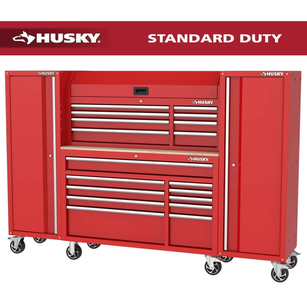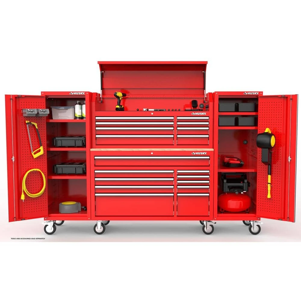 Husky Modular 52 in. W 10-Drawer Red Mobile Workbench Cabinet with 52 in. W 8-Drawer Top Chest and (2) 20 in. Side Lockers is part of a system that allows you to customize your own steel storage configuration. This particular combo consists of the 52 in. 10-Drawer Mobile Workbench, 52 in. 8-Drawer Top Tool Chest and (2) 20 in. Side Lockers. All components are constructed of an all-welded 21-Gauge steel frame and the workbench has a 3/4 in. solid wood top. All drawers have a pre-cut liner and are equipped with 100 lbs. rated ball-bearing slides that feature a soft-closing mechanism that ensures your drawers do not slam closed. There are integrated power strips with 6 outlets and 2 USB ports in both the top till and side of the workbench that will enable you to charge your tools and other electronics. The side lockers each have 3 adjustable height shelves that will allow you to configure the storage to best fit your needs. The inside of the doors has peg hook holes to organize hanging tools and supplies. 2 grommets will allow you to pass any cords into the locker. Finally, 1-can easily move the entire system around the workspace on 5 in. x 2 in. casters with the large ergonomic push handle. This Husky Modular system will be a great addition to your workspace on its own or combined with the additional modular components.