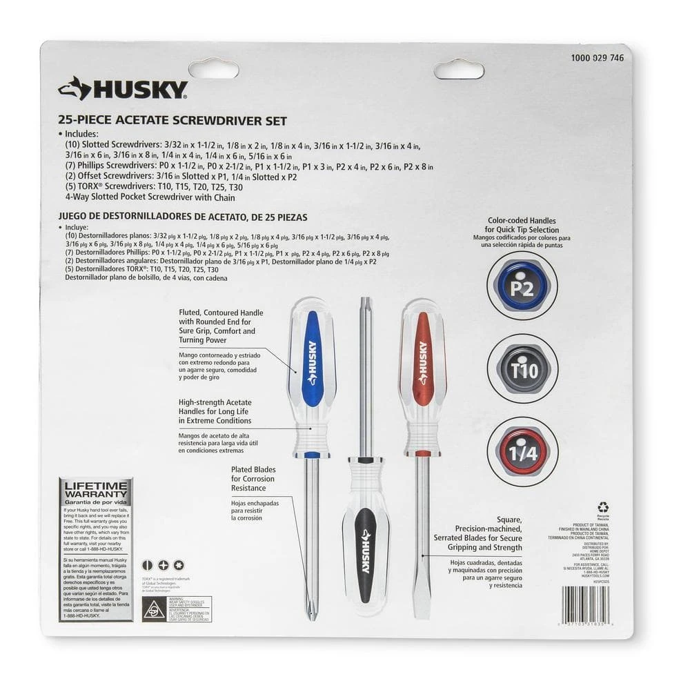 The Husky Variety Screwdriver Set (25-Piece) features an impact- and chemical-resistant acetate handle. The forged steel blade is chrome plated for added corrosion resistance and square to grip with a wrench. The slotted tips are serrated which provides increased grip and reduces slipping to better avoid fastener rounding. The Phillips tips are precision formed to fit the fastener each and every time.