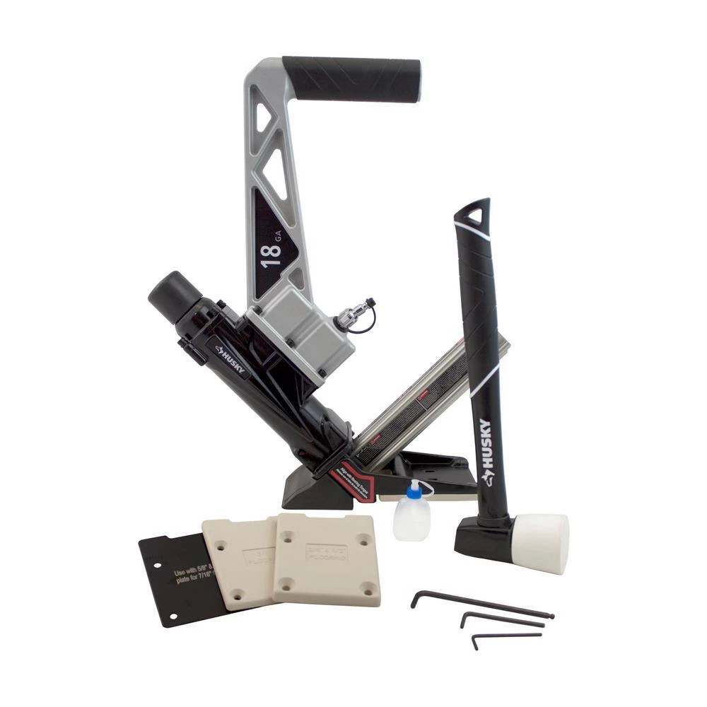Install tongue-and-groove hardwood with ease with this Husky Pneumatic 18-Gauge 1-3/4 in. L-Cleat Flooring Nailer. Designed for dense wood like bamboo, teak or cherry, this powerful tool has thinner L-cleats for better penetration. It’s compatible with 18-Gauge L-cleats from 1-1/4 in. to 1-3/4 in. and it features an adjustable, no-mar front foot and three interchangeable base plates. This nailer includes a fiberglass mallet with a rubber head, air tool oil and adjustment tools so you can take on any project.