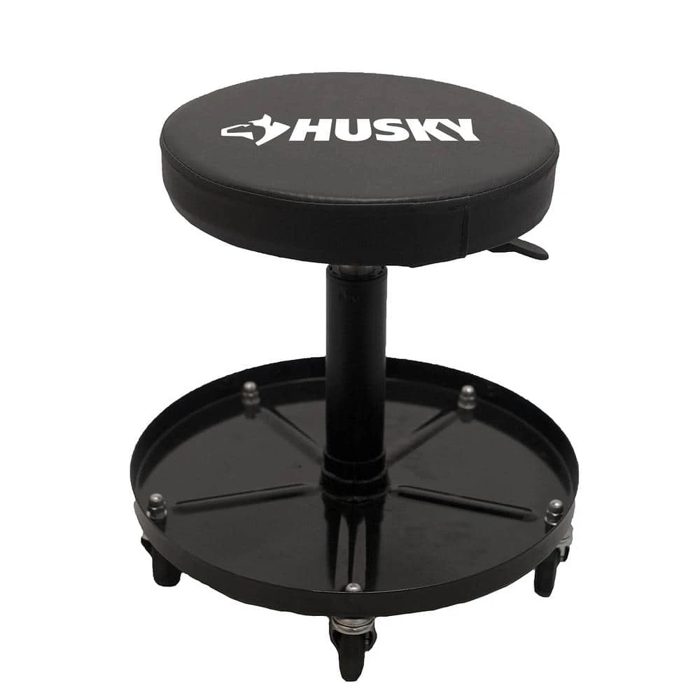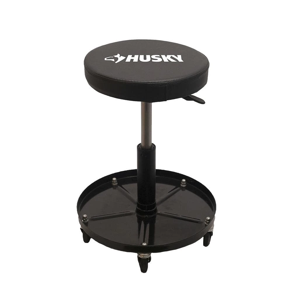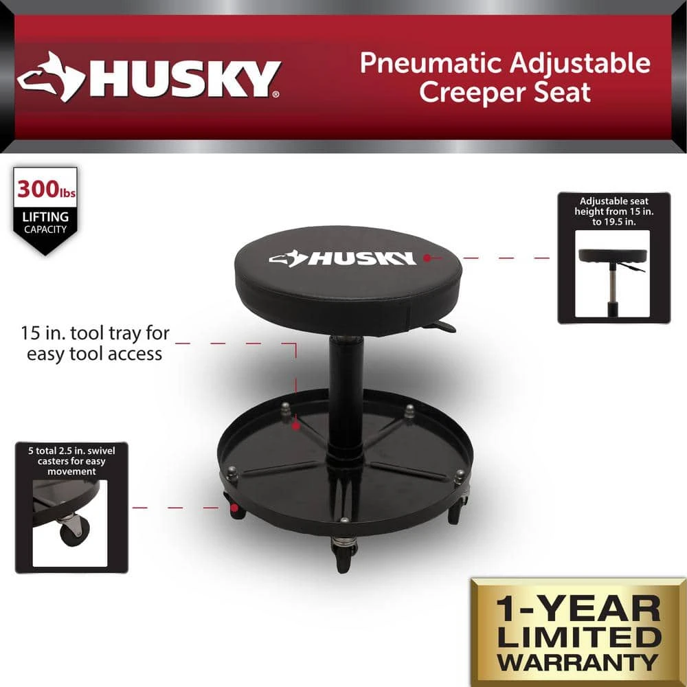 Introducing the Husky Pneumatic Adjustable Seat, an essential addition to your garage or workshop. Enjoy the comfort of its cushioned seat, designed to enhance your working experience. With its adjustable height feature, this seat accommodates various tasks, supporting up to 300 lbs with ease. Move effortlessly around your workspace using the five 2-inch swivel casters, ensuring smooth mobility wherever you need to be. Keep your tools organized and within reach using the convenient 15-inch tool tray attached to the seat. Upgrade your workshop setup with the Husky Pneumatic Adjustable Seat, delivering comfort, versatility, and practicality for your daily projects.