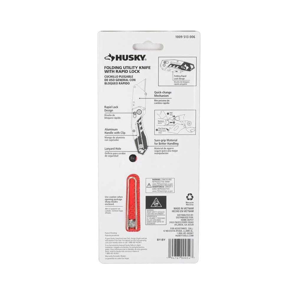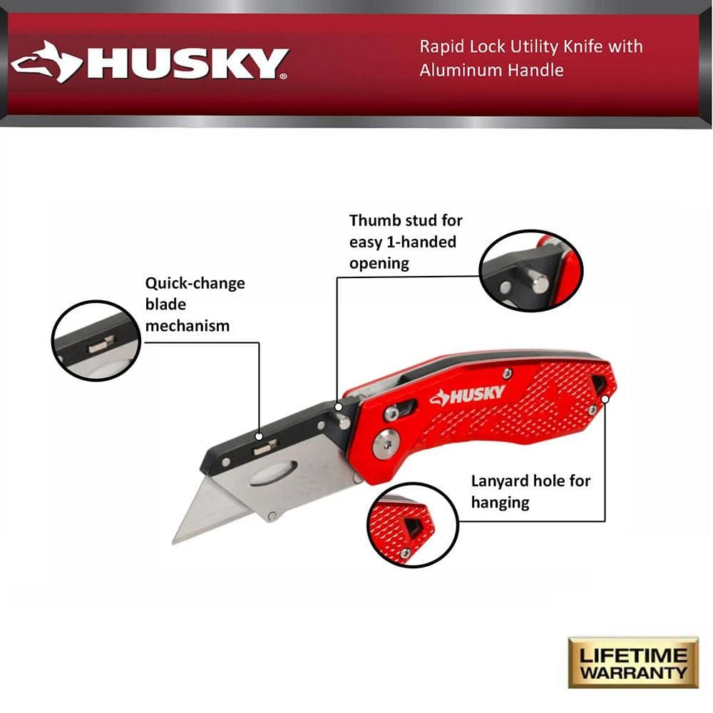 Husky Butterfly Lock Utility Knife with Aluminum Handle features a quick-change blade mechanism that accepts standard size utility blades. The Butterfly Lock design locks the blade in place for safe and efficient cutting. Convenient folding design and lightweight aluminum handle with clip makes it easy for a user to safely store the knife in their pocket. This knife is great for use at home, on the job or outdoors.