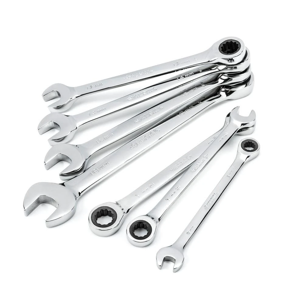 - 7-piece set includes ratcheting wrenches covering sizes 8mm, 10mm, 12mm, 13mm, 14mm, 15mm, 18mm