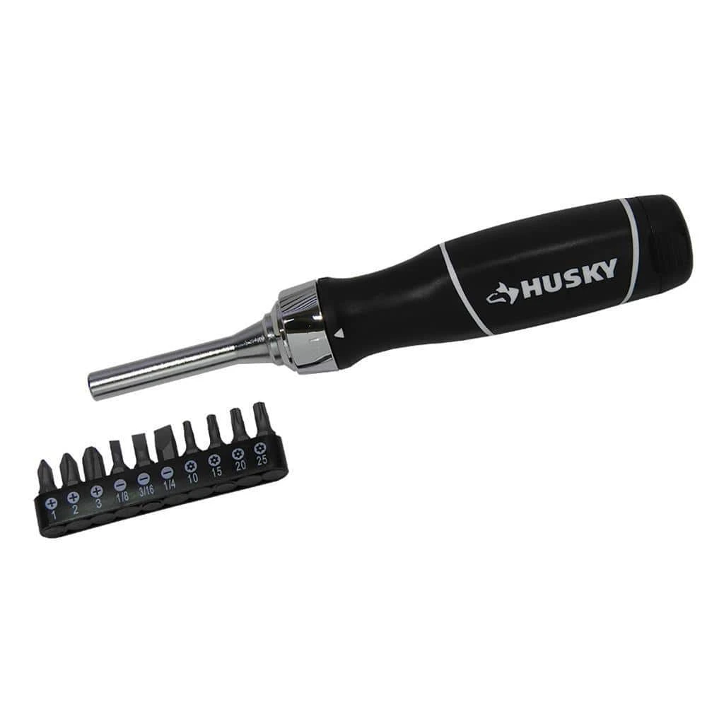 The Husky 10-Piece Ratcheting Screwdriver Set includes 3 Slotted bits, 3 Phillips bits, 4 Tamper Resistant TORX bits. A patented ratchet provides smooth ratcheting action and has greater durability performance. Unique handle design for greater handle torque and comfort.