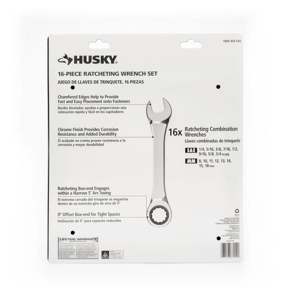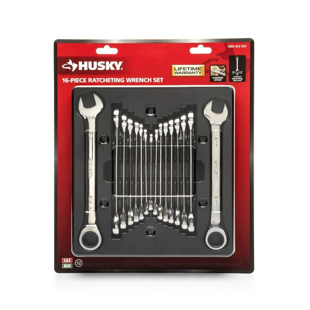 Husky Ratcheting Wrenches feature a 12-point design pattern to help prevent fastener damage and increase torque. A durable, polished chrome finish provides corrosion resistance for a lifetime of use while an alloy steel construction provides long-lasting performance. Wrenches have box-end design for additional leverage and to prevent slipping on hard-to-remove fasteners.