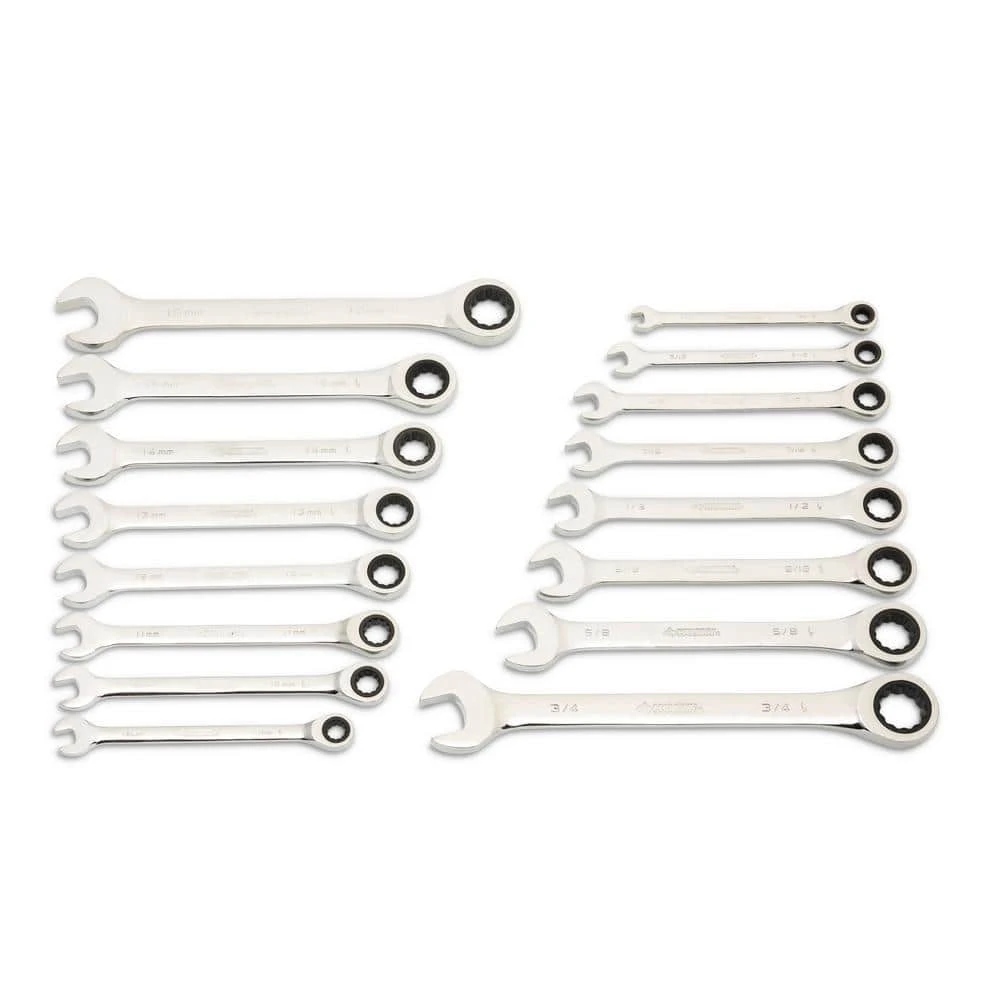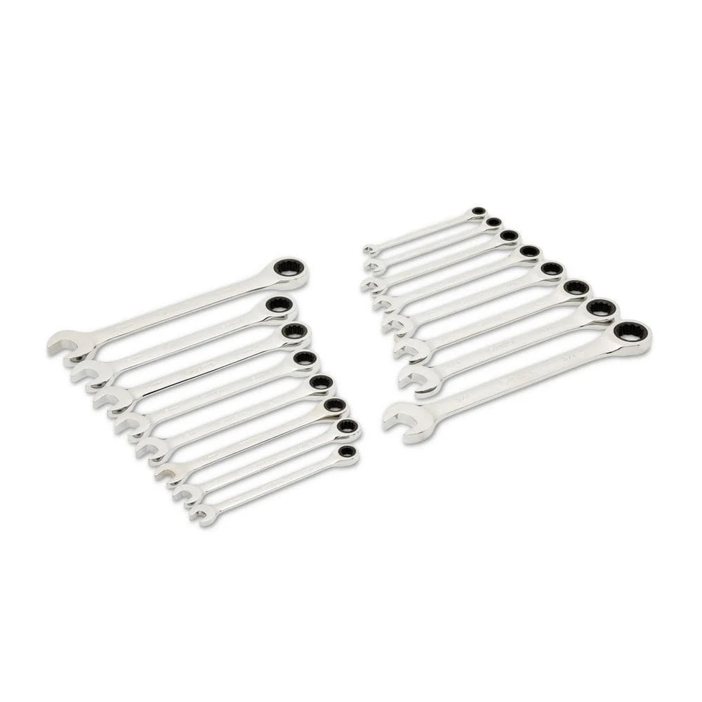 - Set includes 16 standard 12-point ratcheting wrenches covering sizes: eight SAE – 1/4 in., 5/16 in., 3/8 in., 7/16 in., 1/2 in., 9/16 in., 5/8 in., 3/4 in. and eight metric – 8 mm, 10 mm, 11 mm, 12 mm, 13 mm, 14 mm, 15 mm, 18mm