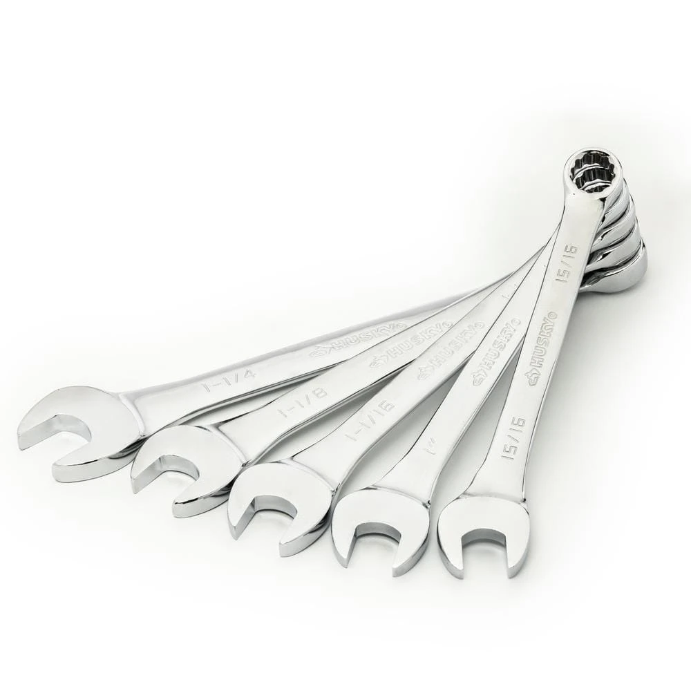 Husky combination wrenches are forged from Chrome Alloy steel for outstanding durability and strength for a lifetime of use. Each wrench as an open-end for access to fasteners in tight spaces and a 12-point box-end to get a secure grip on fasteners when added torque is needed. No toolbox or workshop of the DIYer or professional would be complete without a this set of combination wrenches from Husky.