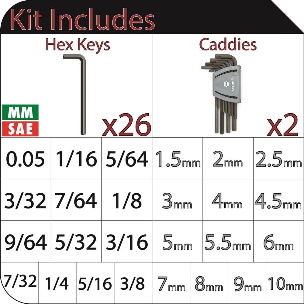 - Husky Hex Key Set includes 13 SAE and 13 metric keys covering sizes 0.05, 1/16, 5/64, 3/32, 7/64, 1/8, 9/64, 5/32, 3/16, 7/32, 1/4, 5/16, 3/8 in. and 1.5, 2, 2.5, 3, 4, 4.5, 5, 5.5, 6, 7, 8, 9, 10 mm