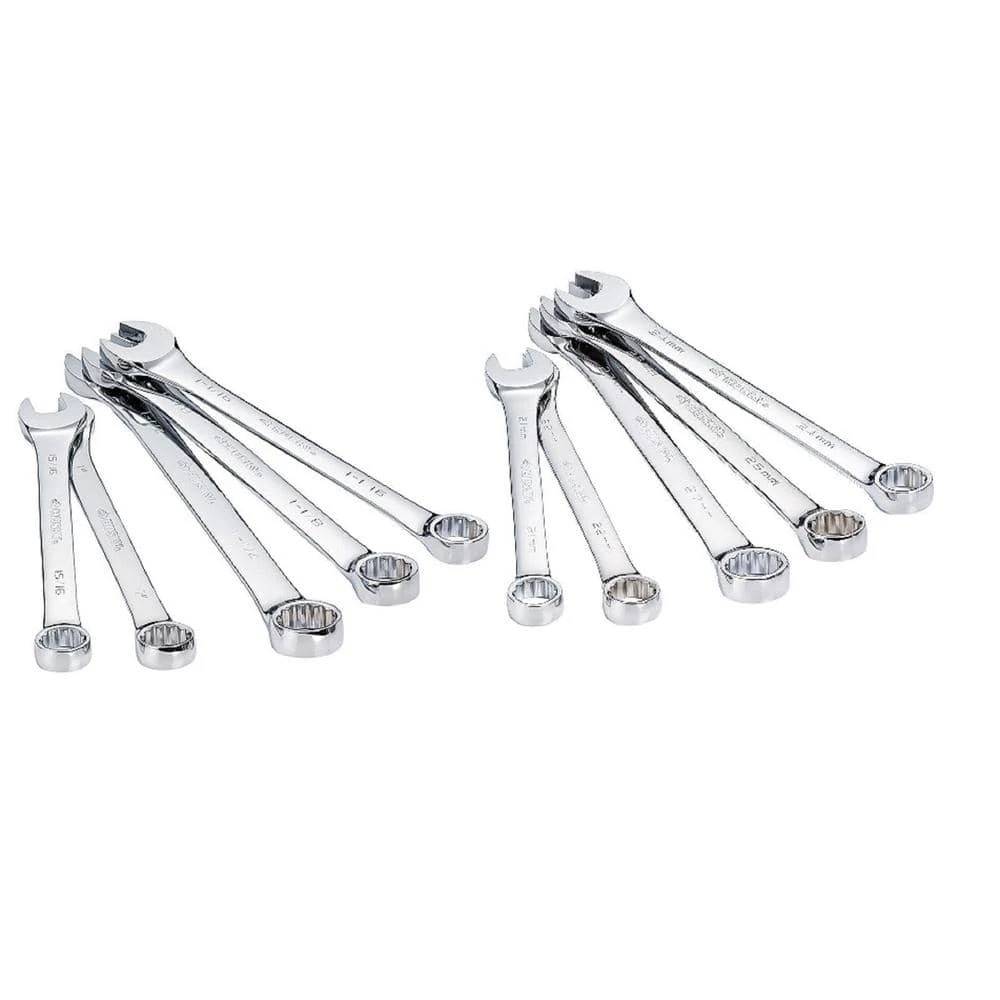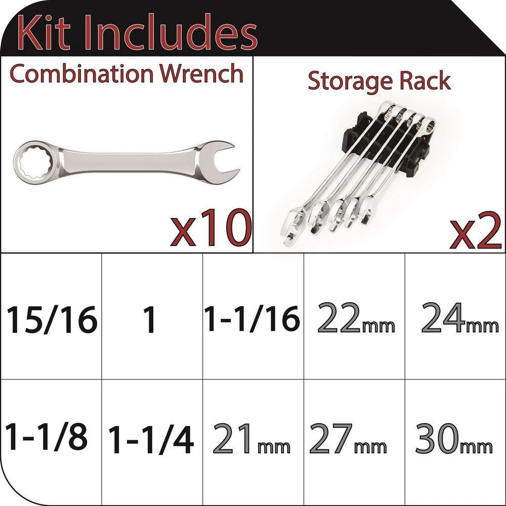 - Set includes 10 combination wrenches covering SAE sizes 15/16 in., 1 in., 1-1/16 in., 1-1/8 in., and 1-1/4 in., and metric sizes 21 mm, 22 mm, 24 mm, 27 mm, and 30 mm