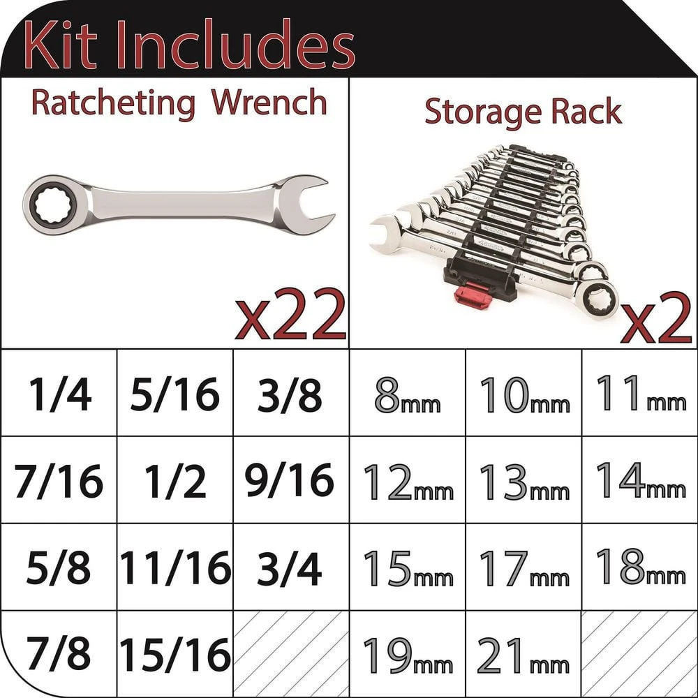 - 22-piece set includes SAE sizes 1/4 in., 5/16 in., 3/8 in., 7/16 in., 1/2 in., 9/16 in., 5/8 in., 11/16 in., 3/4 in., 7/8 in., and 15/16 in., and metric sizes 8mm, 10mm, 11mm, 12mm, 13mm, 14mm, 15mm, 17mm, 18mm, 19mm, & 21mm