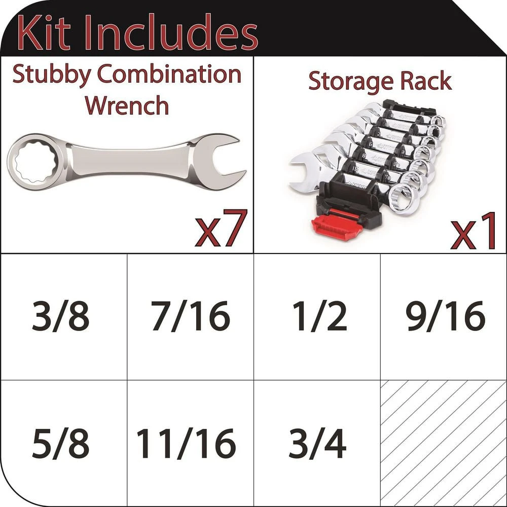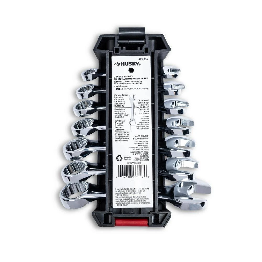 Husky stubby combination wrenches are forged from chrome alloy steel for outstanding durability and strength. The shorter beam design provides access to hard-to-reach fasteners in locations where a standard length wrench just won’t fit. This set of Husky stubby combination wrenches is the perfect set to complete the toolbox of the professional or DIY mechanic.