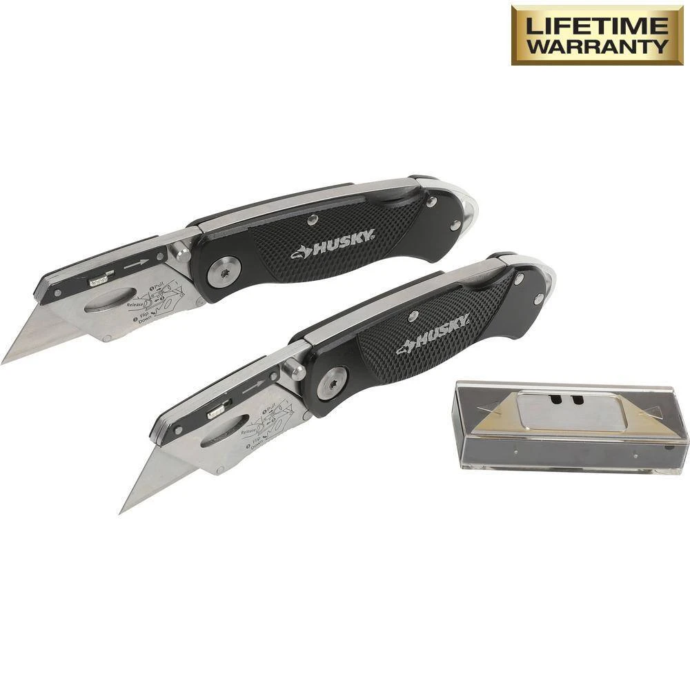 Husky 2-piece Folding Lock-Back Utility Knife comes with 10 utility blades that can lock in place for efficient cutting. The handle is crafted with aluminum for strength and features a folding design to help ensure safety. All Husky hand tools are backed by a -the best in the industry. In the unlikely event that a Husky tool breaks, we’ll replace it free of charge.