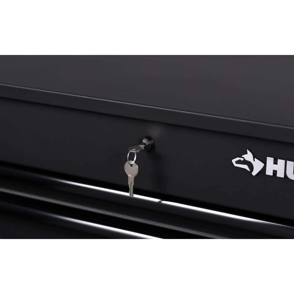 The heavy-duty Husky 31 in. 6-Drawer Black Tool Cart will be a great addition to any workspace or shop. This rolling cabinet is built tough with all-welded 18-Gauge steel construction and finished with a matte black powder coat. The reinforced steel top work surface easily lifts with the assistance of gas struts to reveal an additional storage area adequately sized for deep sockets and trays. Each drawer is equipped with 120 lbs. rated soft-closing slides and a pre-cut liner. The bottom deep drawer has 2 sets of slides to accommodate heavier items. A built-in power strip is uniquely reversible to face either inside the top tray or outside the workstation to power up your tools. A 3-port power tool holder is secured on the left side of the cart with a shelf for battery chargers. 6 hooks are provided on the side and rear of the service cart for cord management and better storage. On the right-hand side, a 10-port slotted holder can be used for screwdrivers, pry bars, or other skinny tools. The cart can be easily moved around your workspace with the large tubular handle and premium polyurethane 5 in. x 2 in. casters.