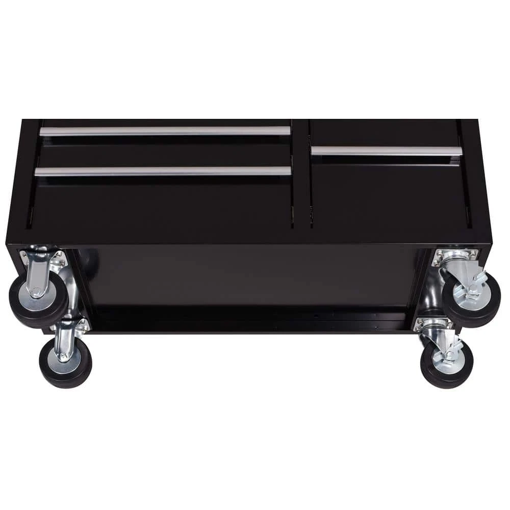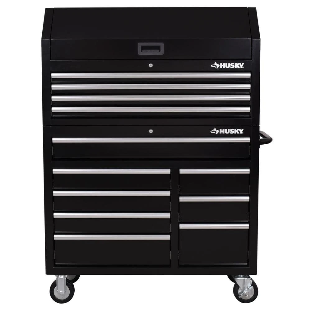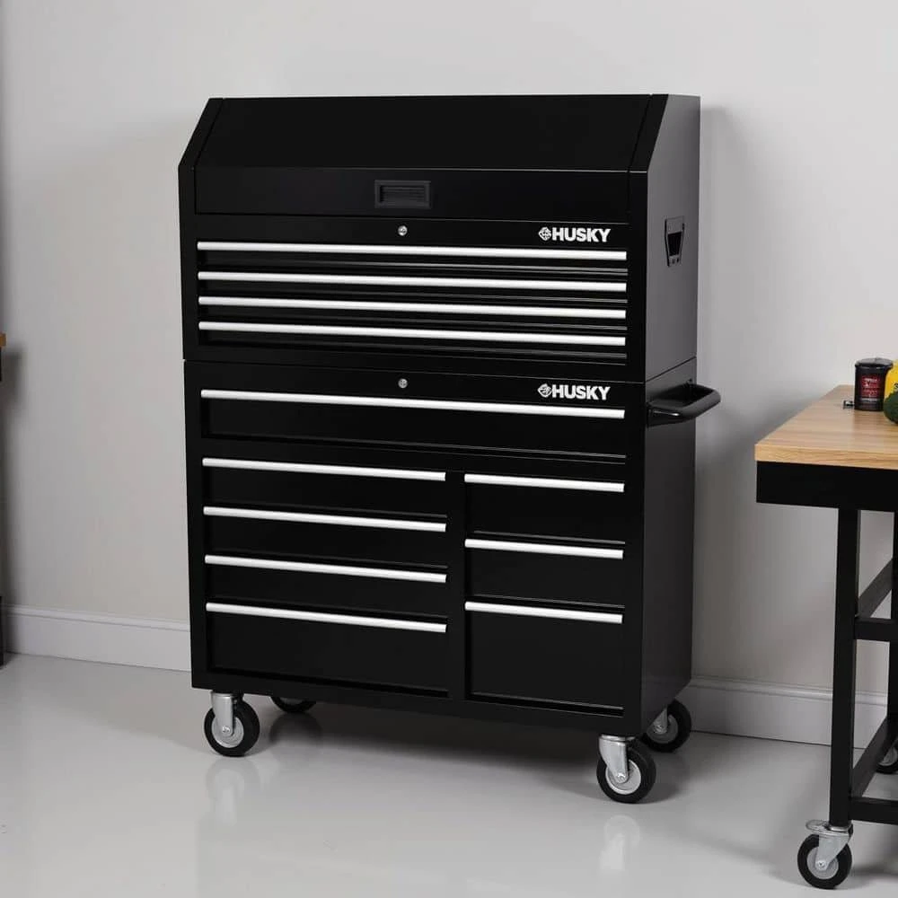 The Husky Standard Duty 42 in. 12-Drawer Black Tool Chest Combo is another great tool storage option available at The Home Depot. This combo is constructed with 21-Gauge all-welded steel and finished with a tough rust-resistant black powder coat. 100 lbs. rated ball-bearing slides have soft-closing feature ensuring your tools stay in place when shutting your drawers. Each drawer also has a pre-cut liner to protect your tools and drawers. The top chest has 4 full width drawers and clamshell top till underneath a dual gas strut supported lid. There is also an integrated power strip with 6 outlets and 2 USB ports within the top till that can charge tools, batteries or other electronic devices. The bottom cabinet has 1 full-width drawer and 7 split drawers for additional storage. The ergonomic push handle can be installed on either side of the cabinet to best accommodate your needs. Finally, the entire combo has 5 in. x 2 in. casters that make it easy to move the unit around your workspace.