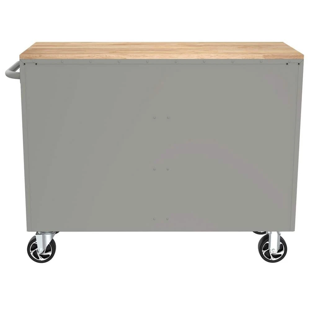 The all new Husky 46 in. W x 18 in. D 9-Drawer Mobile Workbench Cabinet has arrived. This workbench has a 21-Gauge steel frame finished with a gloss gray powder coat finish. There is a solid wood top that provides a 833 sq. in. work surface. On the right hand side is an integrated power strip providing 6 outlets and 2 USB ports to power and charge tools and batteries. Each of the drawers comes with a pre-cut liner and is supported by soft-closing ball-bearing slides that support up to 100 lbs. The deeper bottom drawers have a second set of slides to support heavier and bulkier items. A tubular side handle allows 1 to bring the workbench to wherever it is needed. 5 in. x 2 in. casters have a total load capacity of up to 1500 lbs.