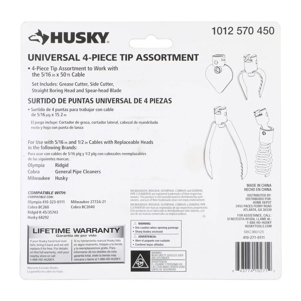 The Husky Universal Drain Auger Cutter Head Accessory Kit includes 4 quick-connect drain auger accessory bits, a quick-release key, and an adapter for slotted style cable heads. These accessories are constructed of heavy duty tempered steel to combat the toughest blockages. A retaining ring is included for tidy storage, keeping the accessory components together for when you need them. Built to last and backed by the Husky lifetime warranty.