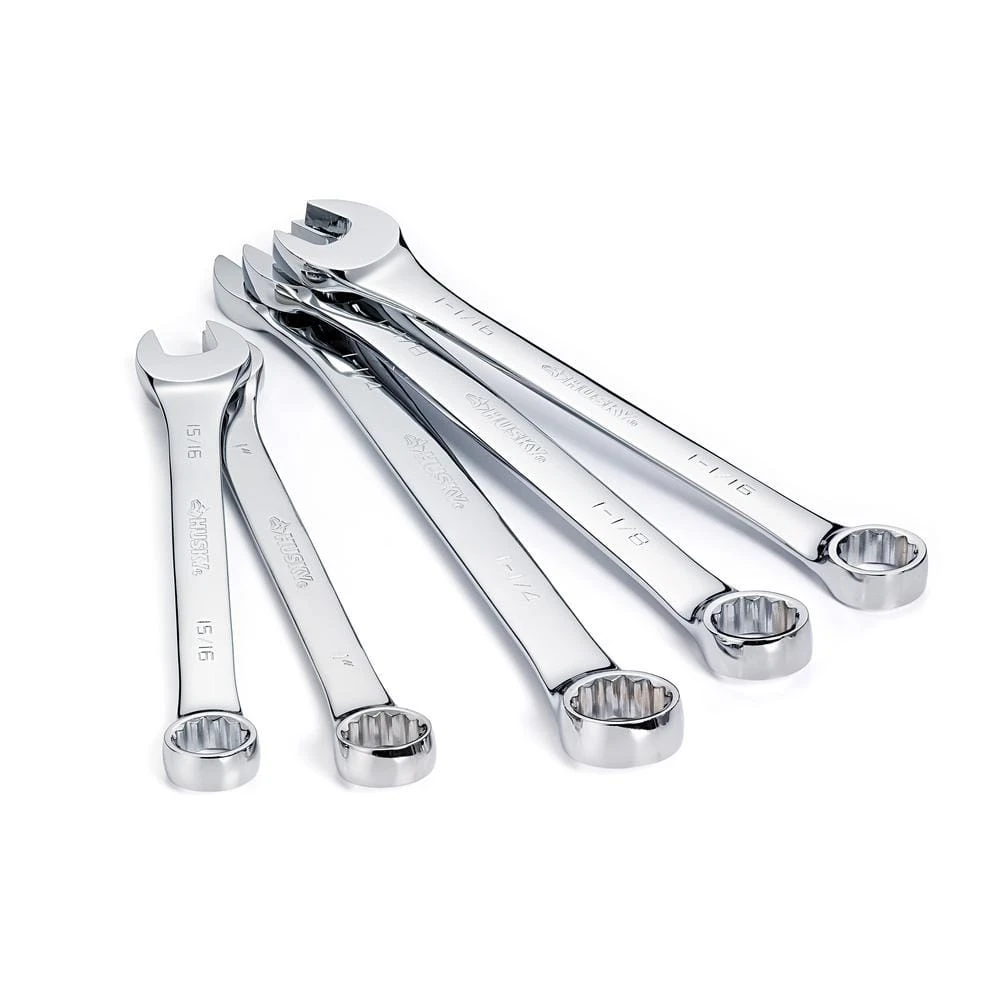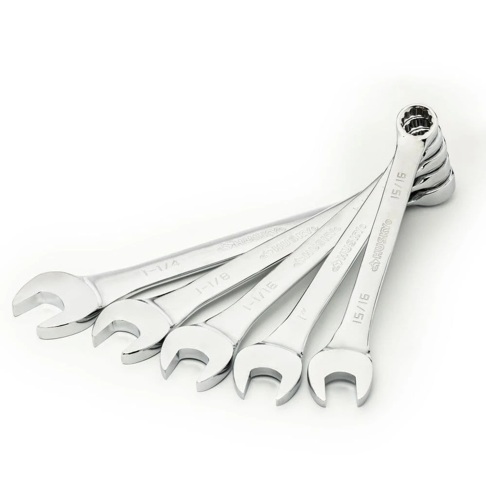 Husky combination wrenches are forged from chrome alloy steel for outstanding durability and strength for a lifetime of use. Each wrench has an open end for access to fasteners in tight spaces and a 12-point box end to get a secure grip on fasteners when added torque is needed. This set of extra-large combination wrenches is perfect for those large fasteners commonly found on big equipment, engines, or industrial job sites.